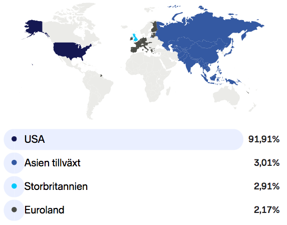 Tabellen ovan visar mot vilka länder som fonden hade störst exponering mot i början av 2025. Bolag etablerade i USA stod för störst andel av den totala fondportföljen.