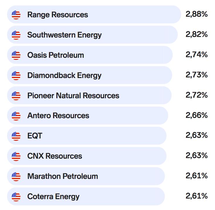 Exempel på oljebolag som ingår i fondportföljen är Exxon Mobil Corp, Chevron Corp och Occidental Petroleum Corp. Dessa stod för 2.53 %, 2.51 % och 2.47 % av den totala portföljen.