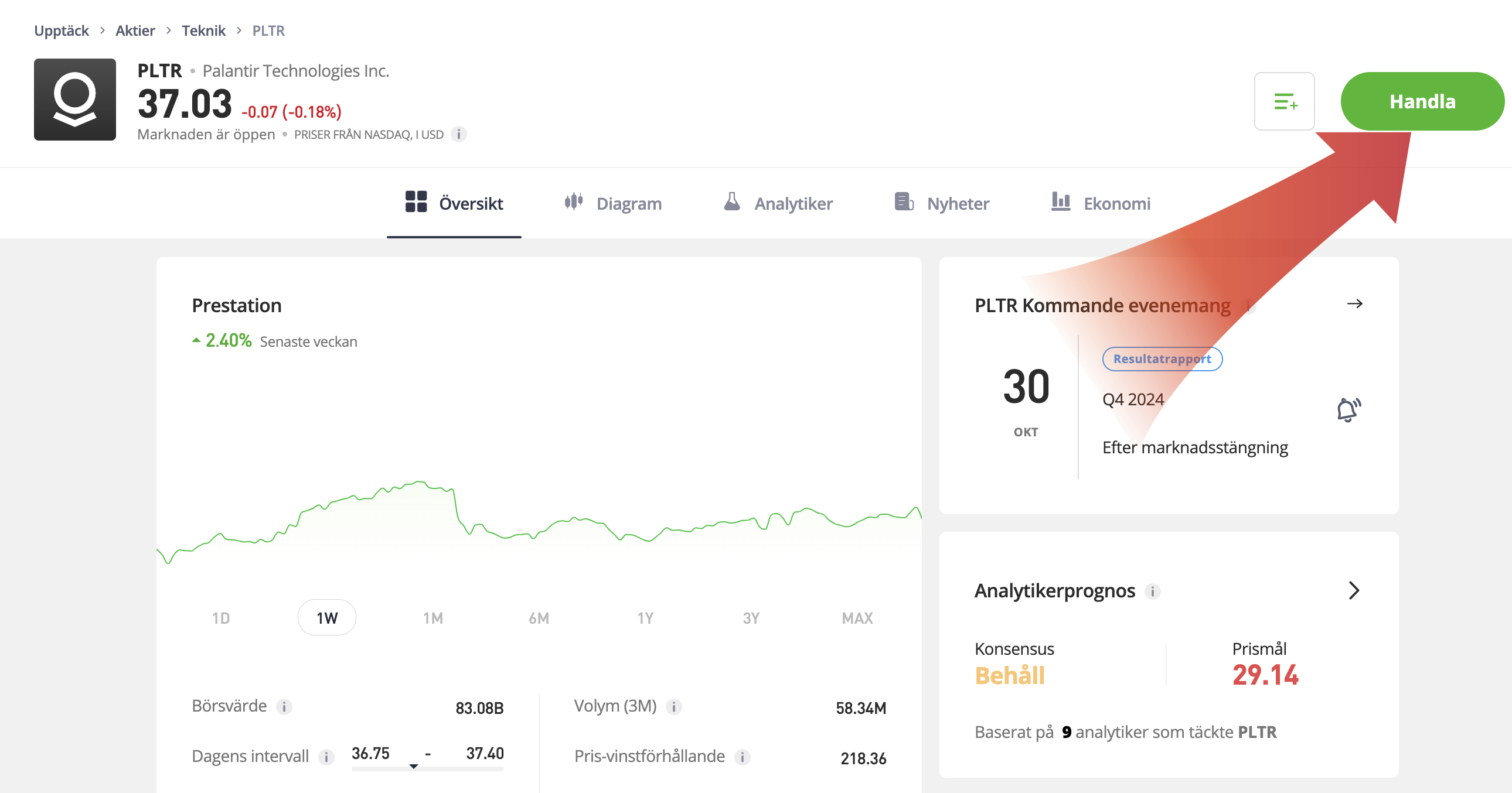 Palantir Technologies kan handlas hos både eToro och Avanza. Bolaget är noterat på NYSE under tickern “PLTR”.