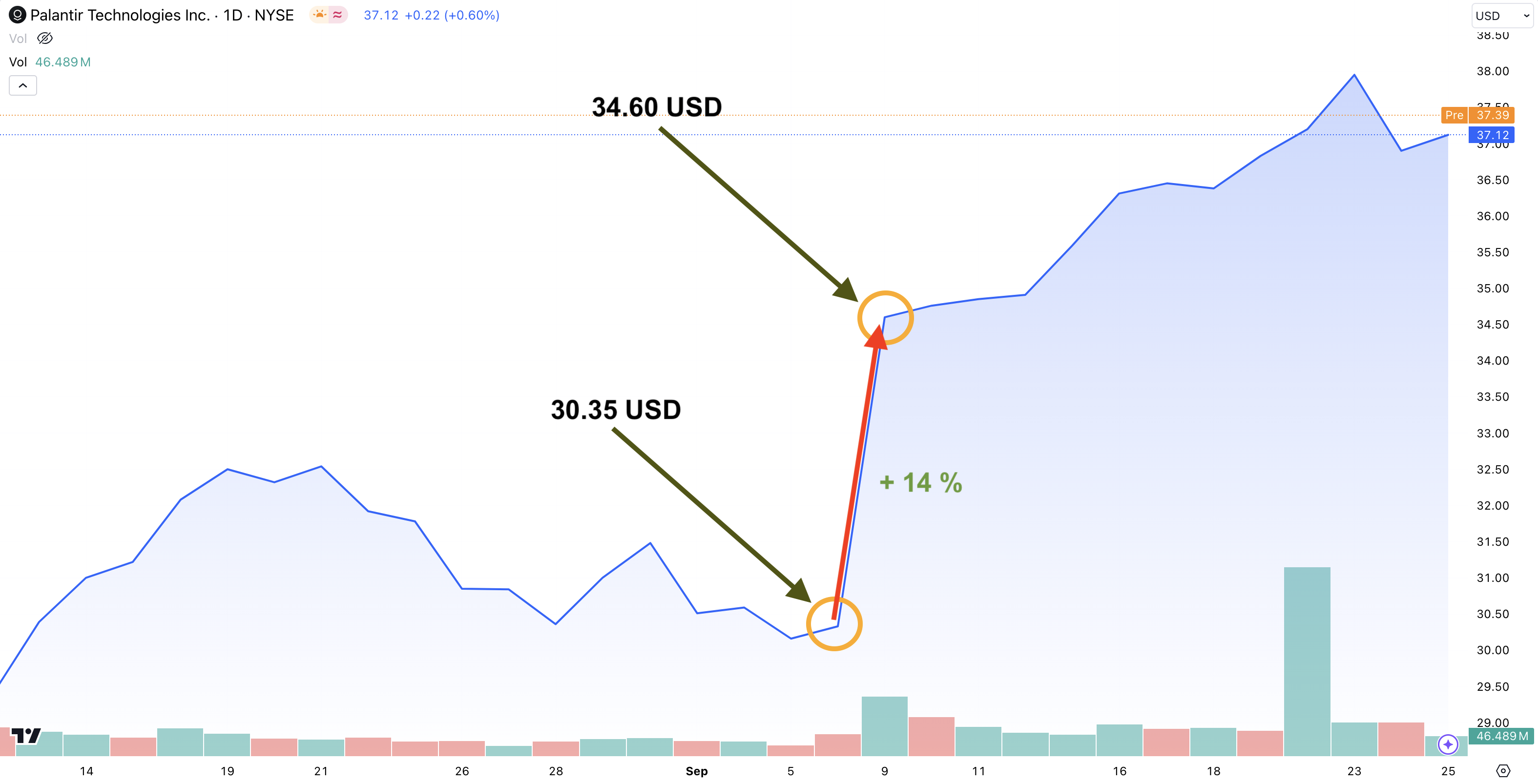 Troligt är att efterfrågan på aktien bör öka, vilket potentiellt kan leda till högre likviditet och värdering. På samma dag som nyheten publicerades steg Palantirs aktie från 30.35 USD till 34.60 USD. Det är lika med en avkastning på cirka 14 % på endast en handelsdag.