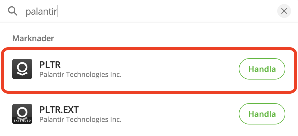 Har du pengar på ditt konto? Då klickar vi på sökknappen, söker och väljer Palantirs aktie.