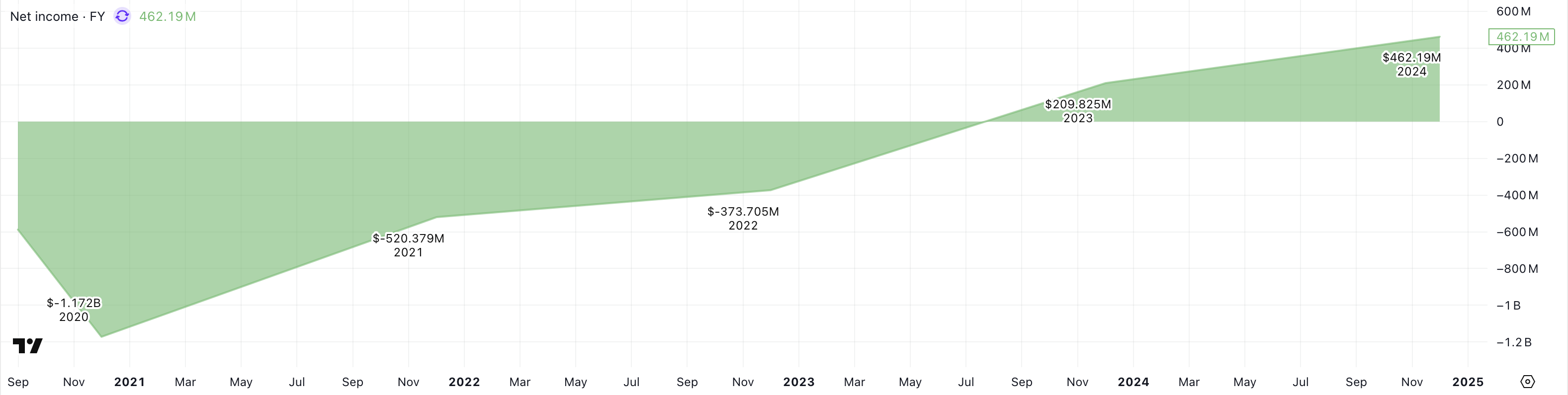 Detta kapitel ger en översikt av Palantir Technologies finansiella prestationer, där både intäkter och vinstutveckling, mellan åren 2020 och 2024, presenteras. All data har hämtats från TradingView.