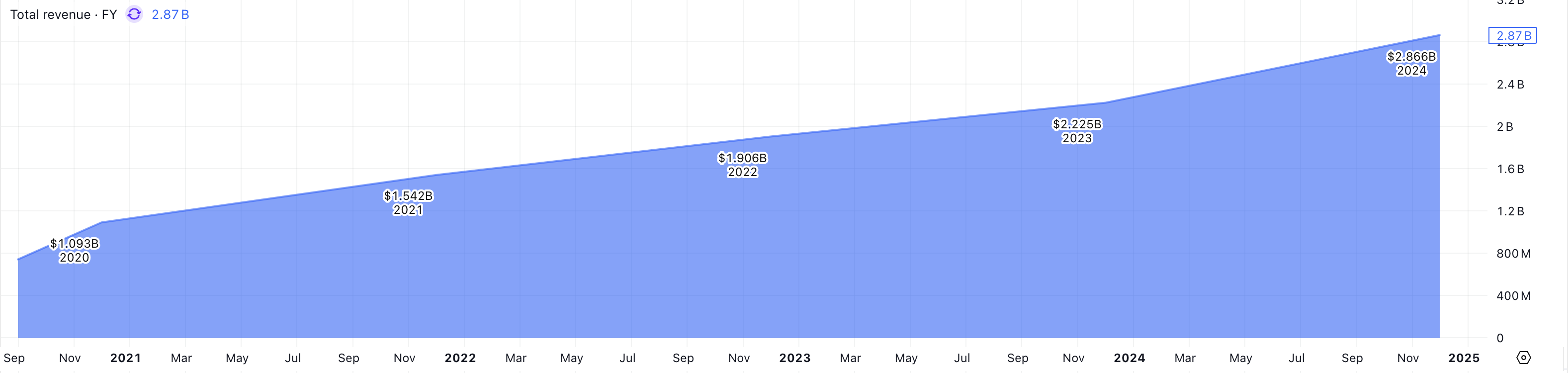Under 2020 rapporterade Palantir Technologies en total omsättning på 1,093 miljarder USD. År 2024 hade omsättningen ökat till 2,866 miljarder USD, vilket motsvarar en genomsnittlig årlig tillväxttakt på 27 %.