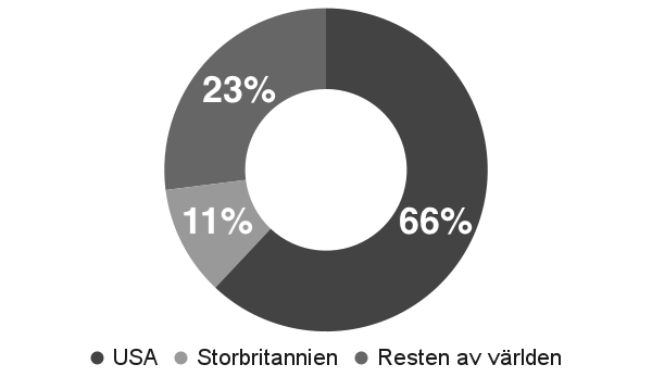 - USA – USA utgör den största delen av Palantirs intäkter med en andel på 66 % av den totala omsättningen. Palantir har lyckats skapa sig en bred kundportfölj i landet. För varje år skriver man nya avtal med viktiga kunder, vilka bidrar till stora intäkter. År 2022 skrev man exempelvis ett stort och långvarigt kontrakt med Lockheed Martin, vilket är ett av de största försvarsbolagen i USA.