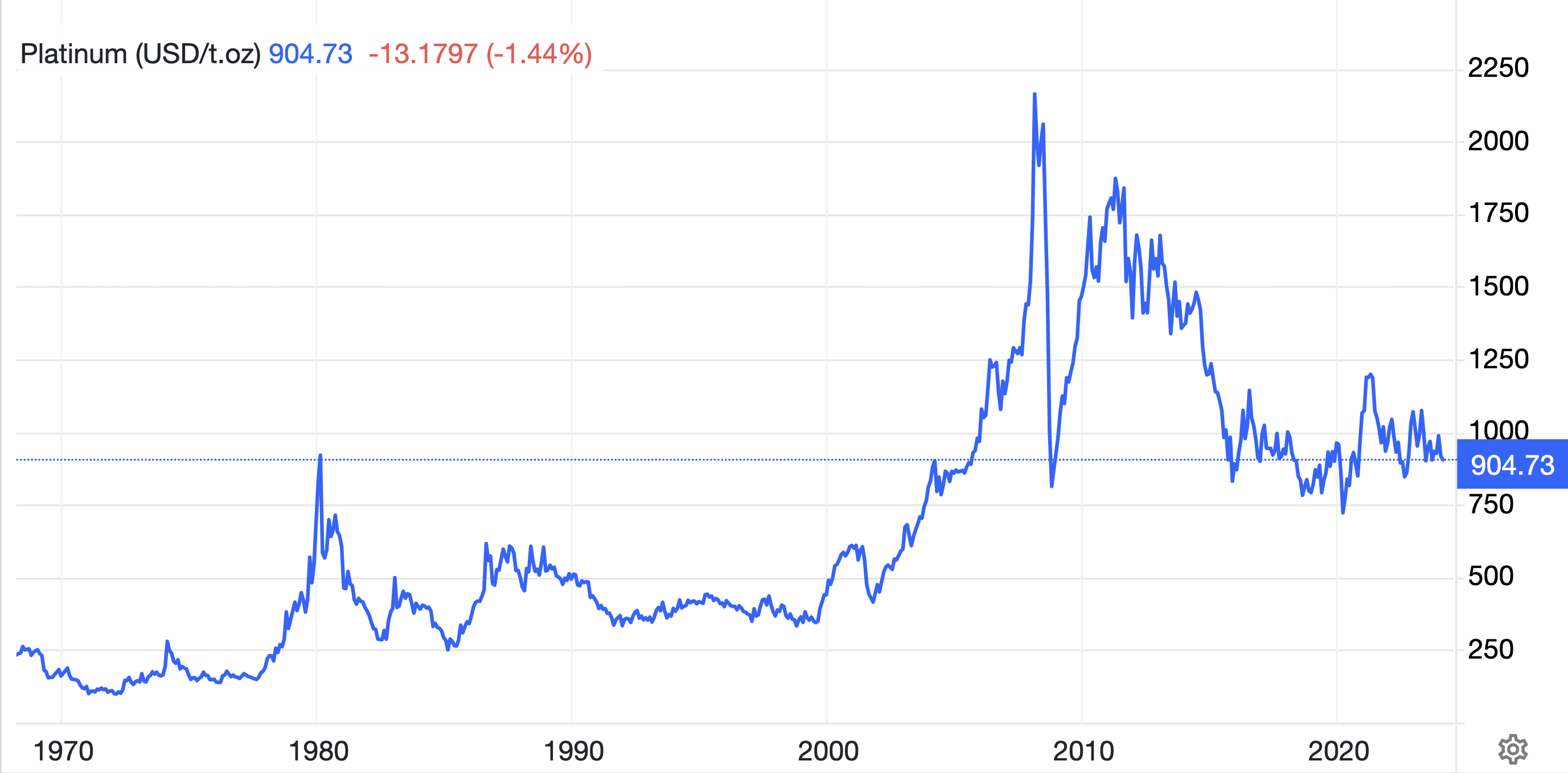 Följande graf visar hur platinas pris rört sig mellan åren 1968 och 2024. Vi kan tydligt se hur platinaprisetnådde en topp år 2008 i samband med finanskrisen. Priset återhämtade sig sig något, men inte helt och hållet, för att sedan se en sakta men sjunkande trend.