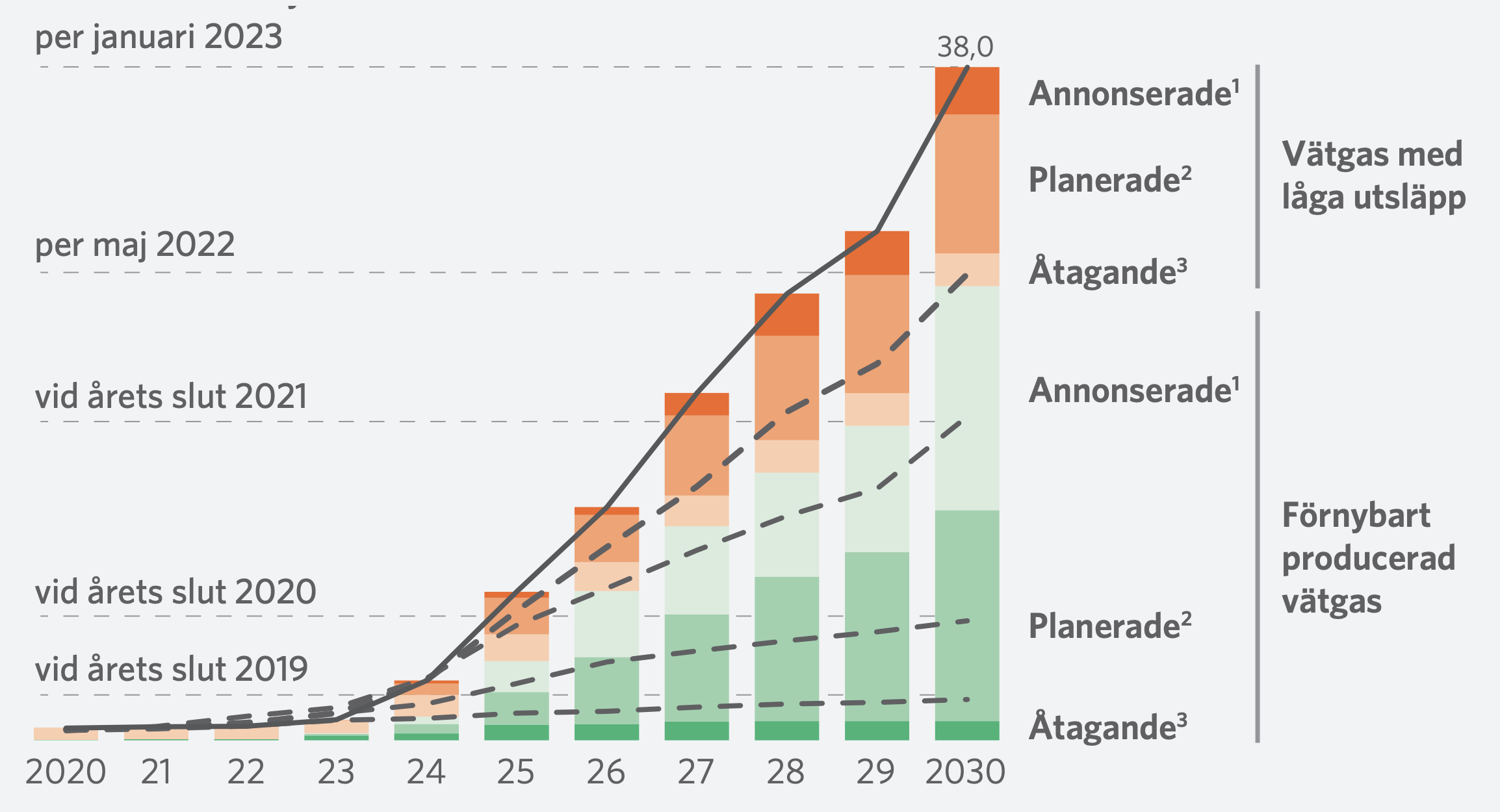 Vätgasindustrin förväntas få hög efterfrågan i framtiden, då politiker globalt strävar efter att ersätta fossila bränslen med hållbara energikällor. PowerCell Sweden har föreslagit projekt för cirka 45 miljoner ton ren vätgas till samma år, varav 70 % utgörs av förnybar vätgas.