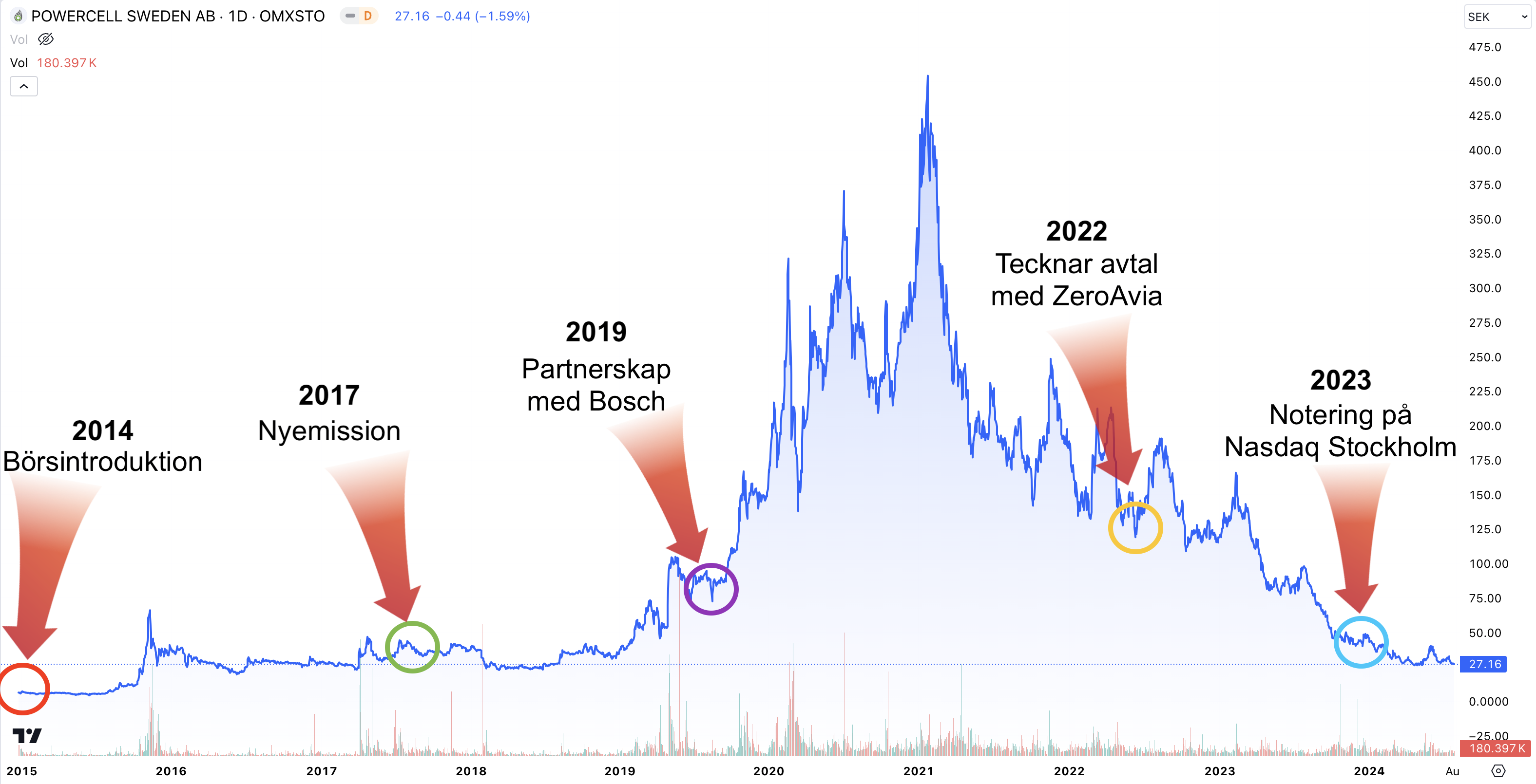 Här nedan visas PowerCells aktiekursutveckling mellan 2015 och 2024. I bilden finns också markerade historiskt viktiga bolagshändelser. Dessa kan du läsa mer om direkt under grafen.