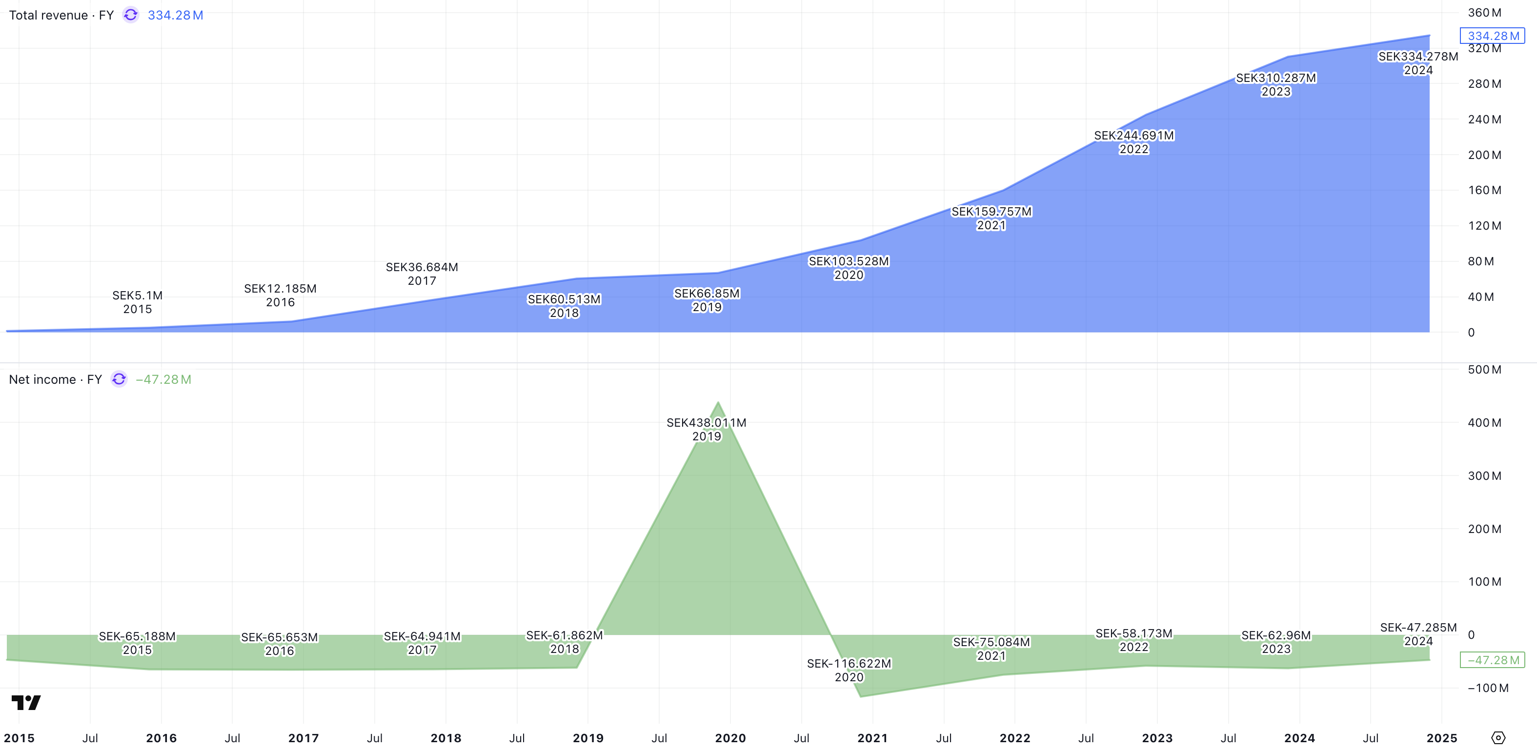 Ovan går att se hur PowerCells omsättning och vinst utvecklats över tid, mellan åren 2015 och 2024. Omsättningen uppgick till ungefär 5 Mkr i början av perioden och 334 Mkr år 2024. Det ger en ackumulerad genomsnittlig ökning med 52 % per år.