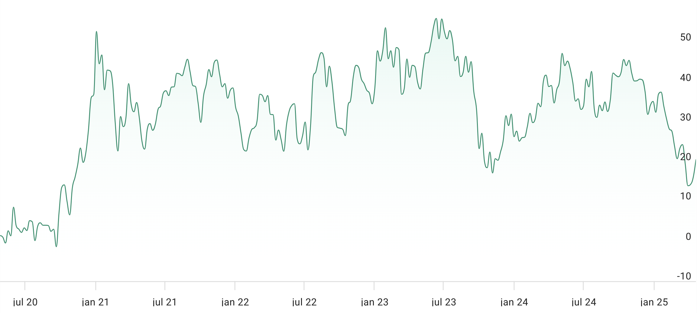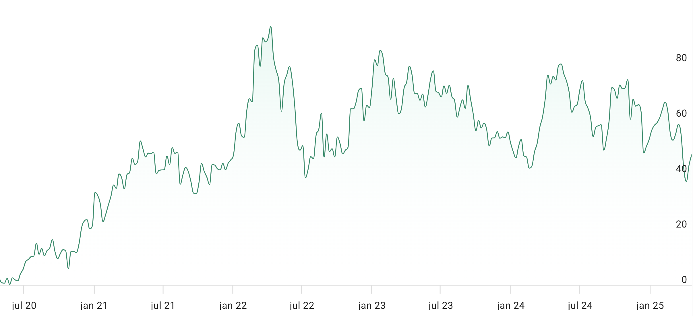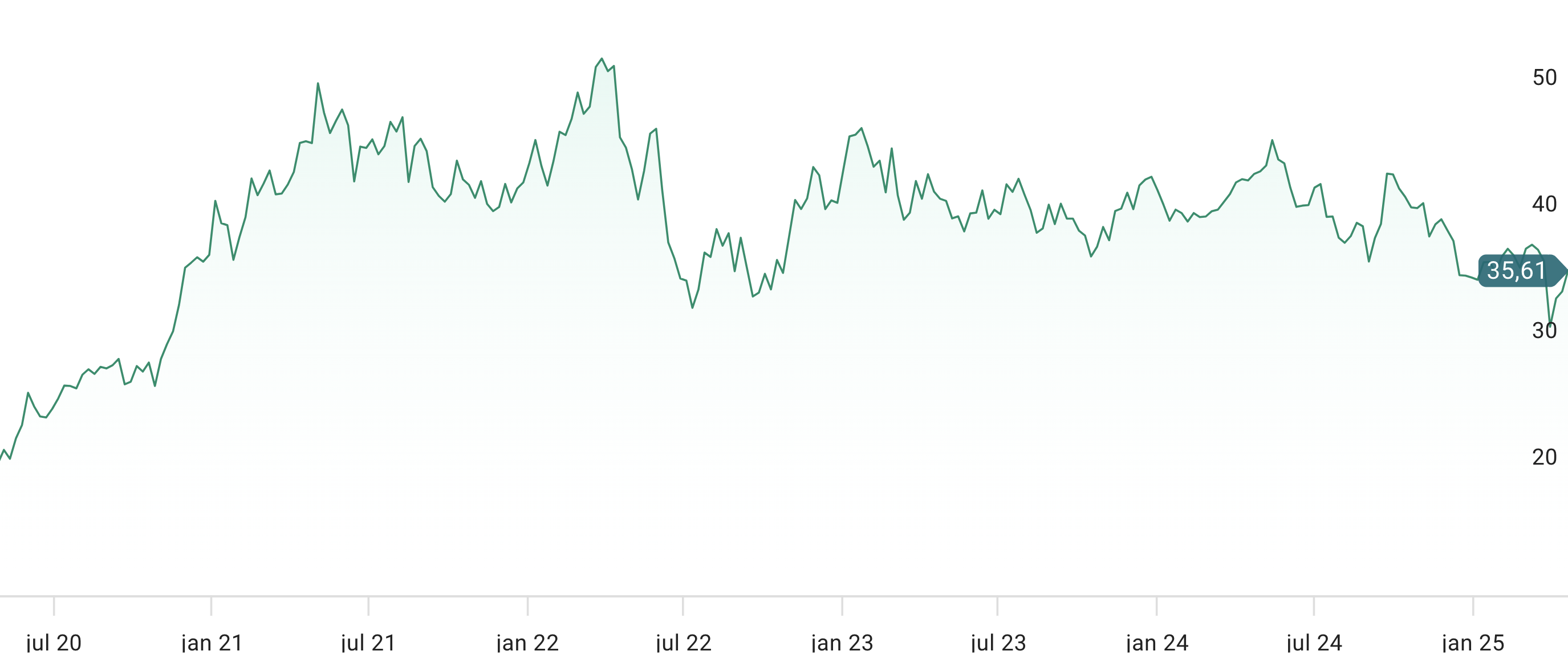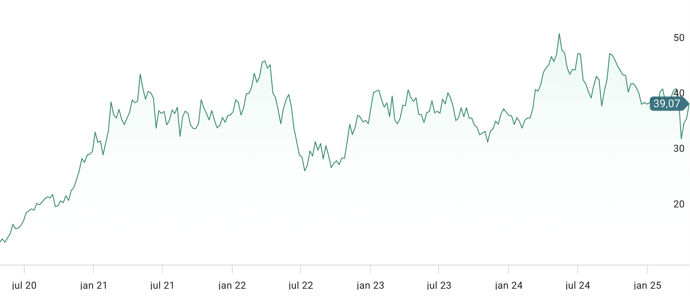 • Kursutveckling 5 år: + 40 % (2020 – 2025)