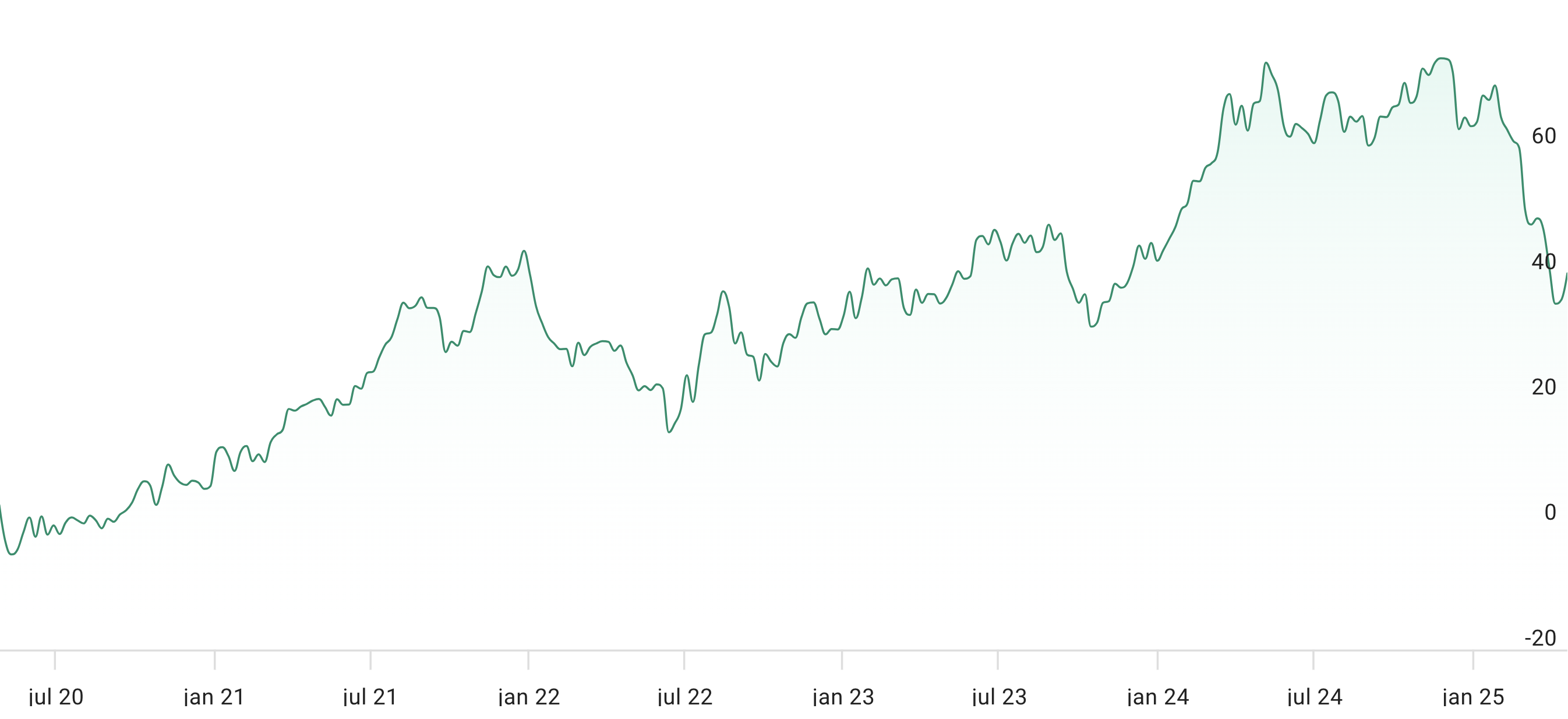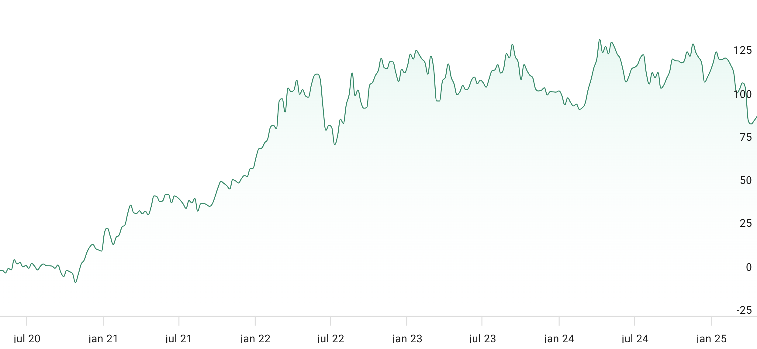 • Kursutveckling 5 år: + 183 % (2020 – 2025)
