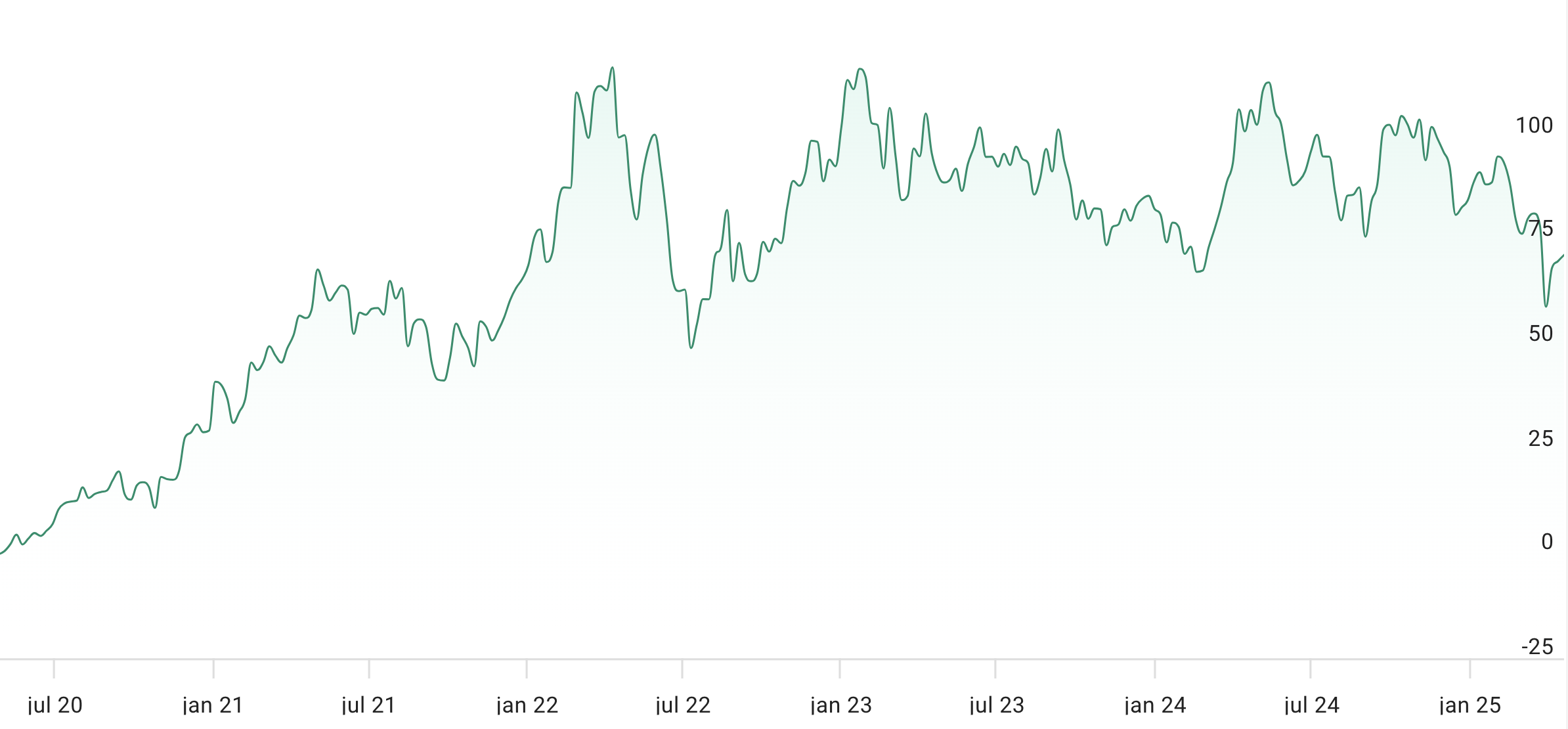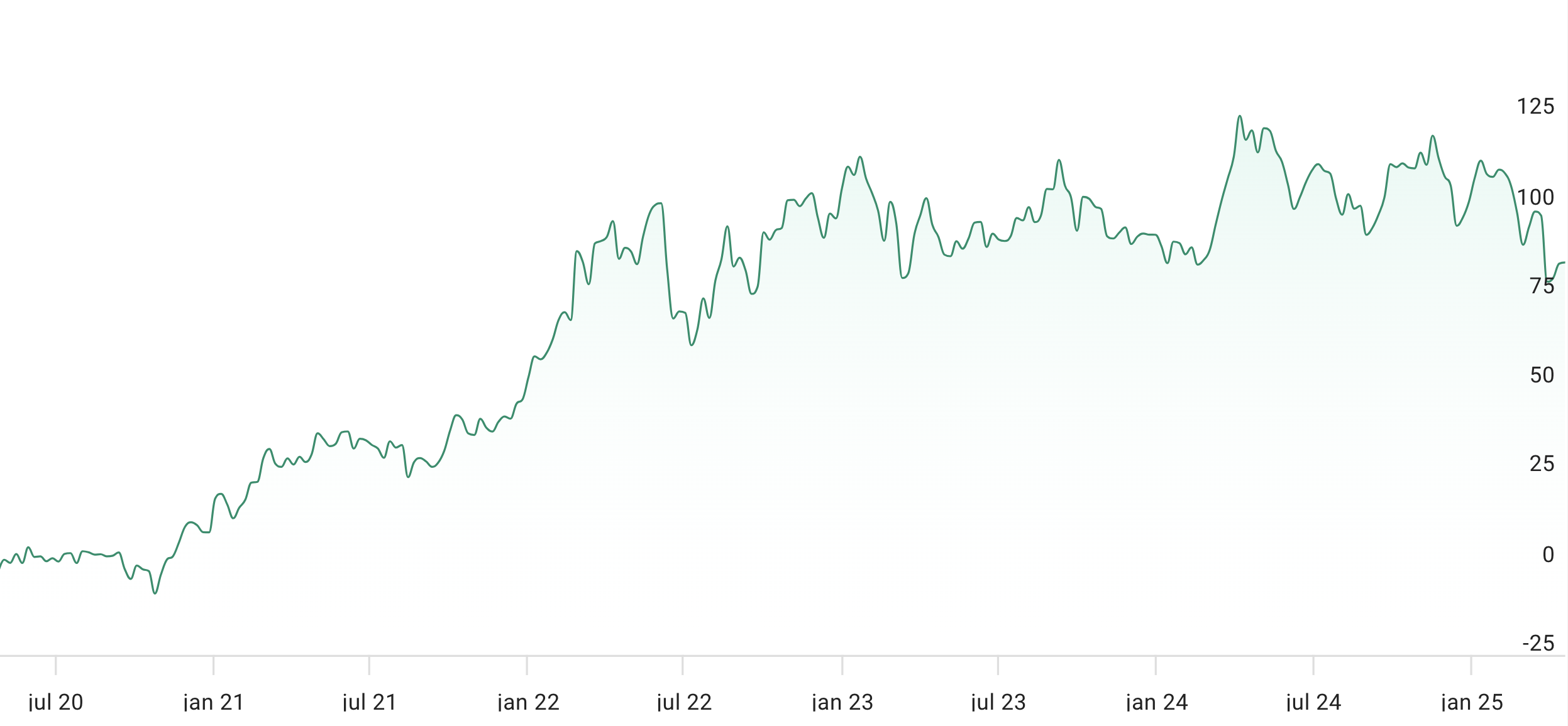 • Kursutveckling 5 år: + 21 % (2020 – 2025)