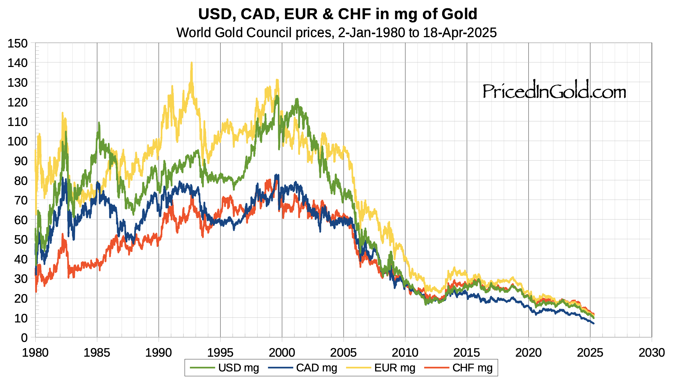 Vissa råvaror ses inte endast som en god hedge mot inflation på kort sikt, utan även ett skydd på lång sikt. Nedan kan du exempelvis se hur några av de mest kända fiatvalutorna (USD, CAD, EUR och CHF) stått sig mot guld under de senaste 80 åren. Samtliga har sjunkit i värde på lång sikt jämfört mot guld.