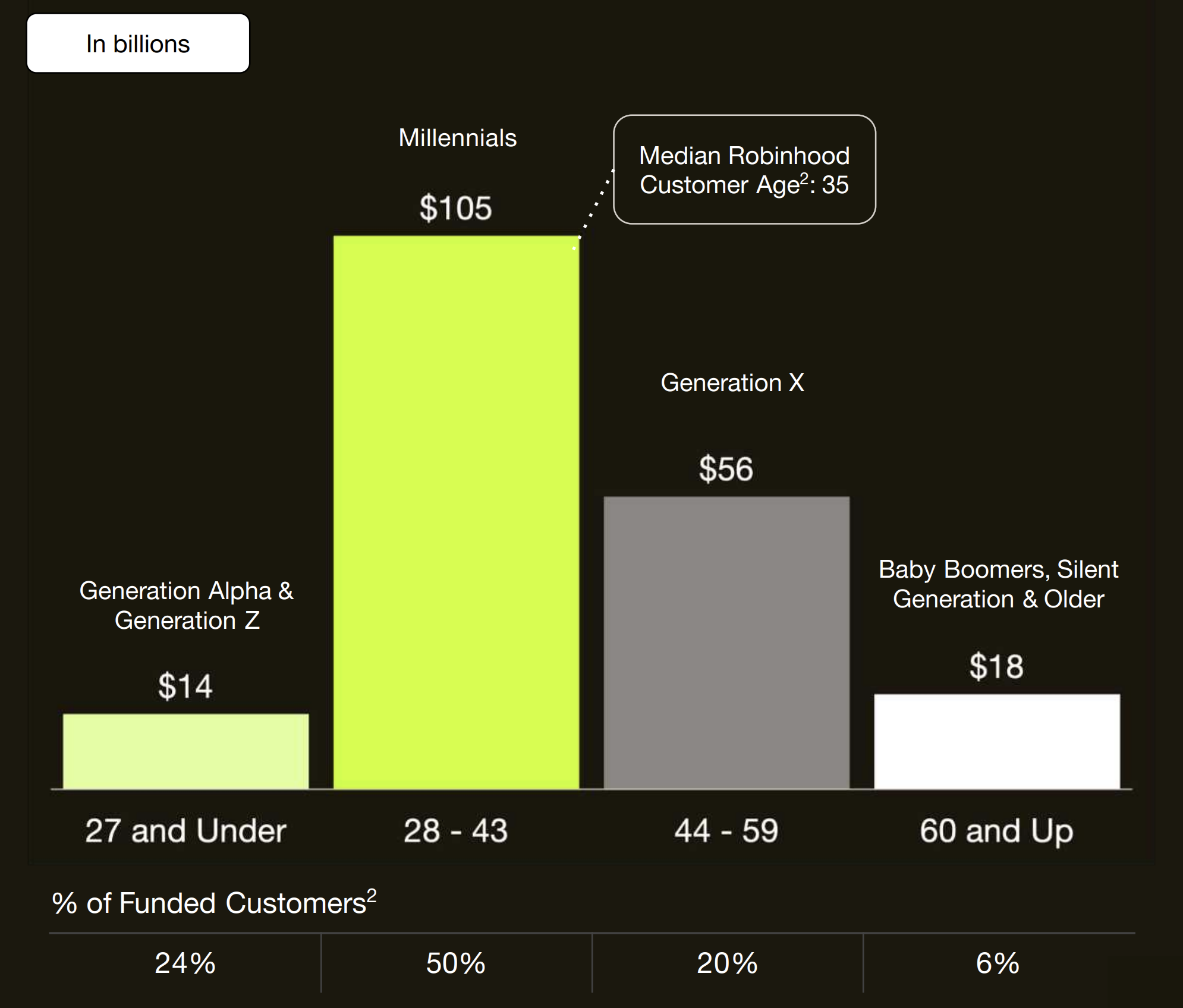 Stapeldiagrammet ovan visar hur mycket tillgångar Robinhoods kunder har under förvar (AUC) fördelat över olika åldersgrupper. Den största gruppen är Millennials (28 – 43 år) med 105 miljarder USD i totala tillgångar, vilket också speglar att medianåldern är 35 för Robinhoodanvändare.