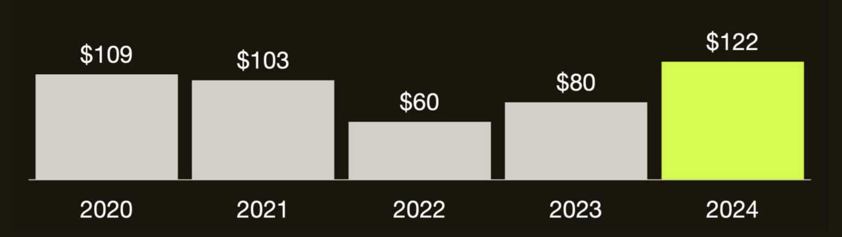 Bilden ovan visar Robinhoods genomsnittliga intäkter per användare (ARPU) mellan 2020 och 2024. År 2020 uppgick ARPU till 109 USD och sjönk gradvis till 60 USD under 2022, en period då handelsaktiviteten minskade efter pandemiboomen. Därefter började ARPU återhämta sig – först till 80 USD under 2023 och sedan till 122 USD 2024.