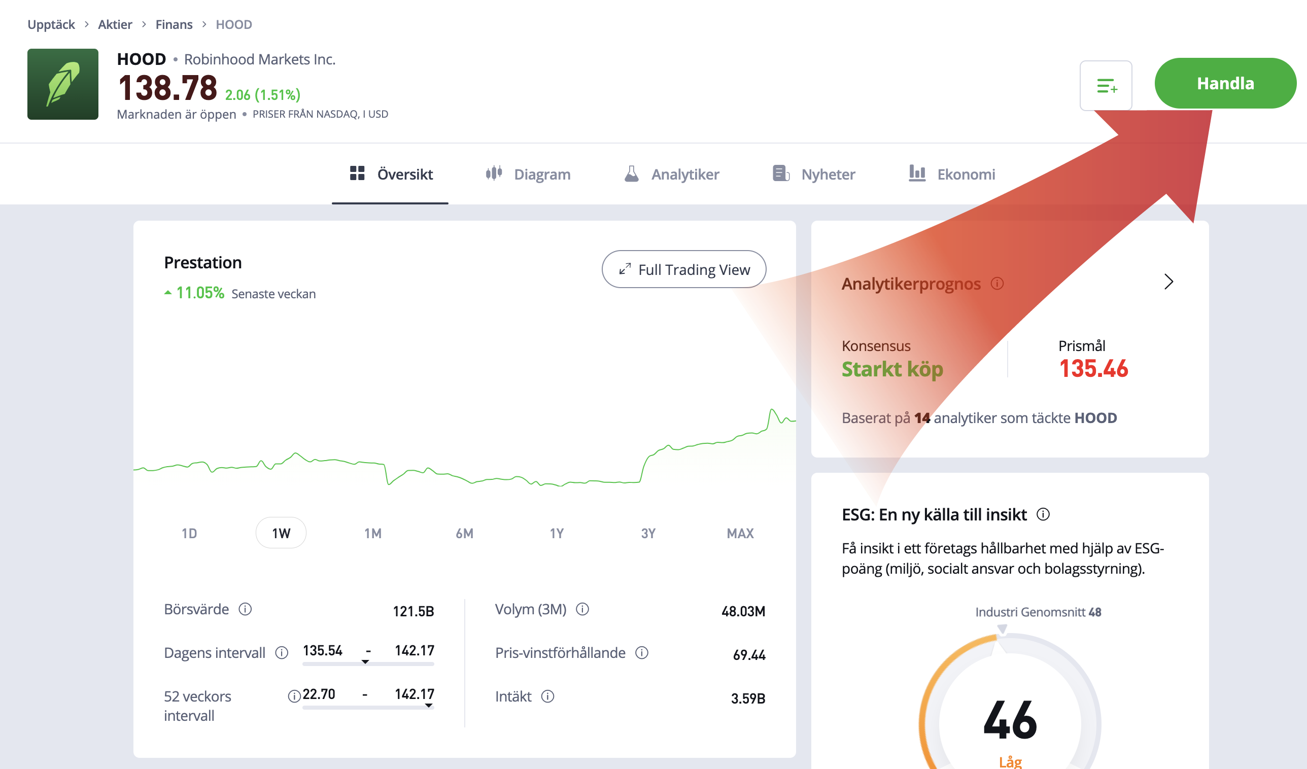 Robinhoods aktie handlas på den amerikanska börsen Nasdaq under symbolen “HOOD”. Den som vill investera i bolaget kan göra det enkelt via globala nätmäklare och handelsplattformar, som till exempel eToro, där ett stort utbud av internationella aktier finns tillgängliga att handla. Läs mer i kapitel 5.
