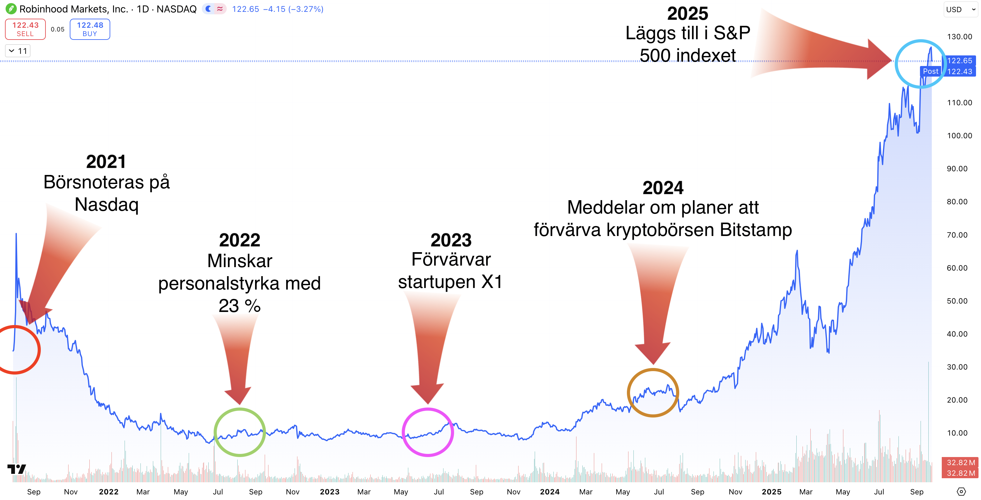 Robinhood introducerades på Nasdaq i juli 2021 till en kurs på 38 USD per aktie. I början av hösten 2025 hade kursen stigit till cirka 123 USD. Det motsvarar en total uppgång på 223 %, eller en årlig genomsnittlig avkastning på 34 %. Under samma period steg S&P 500-indexet med omkring 53 %, vilket motsvarar cirka 11 % per år. Läs mer i kapitel 1.