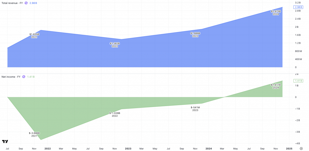 I detta kapitel tar vi oss en närmare titt på hur Robinhood Markets omsättning och vinst utvecklats historiskt. Vi tittar också på hur omsättningen per användare utvecklats genom åren. Data har hämtats från TradingView och bolagets Q4-rapport 2024.