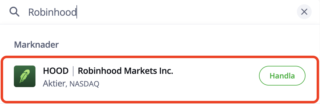 Har du pengar på ditt konto? Då klickar vi på sökknappen, söker efter Robinhood aktie.