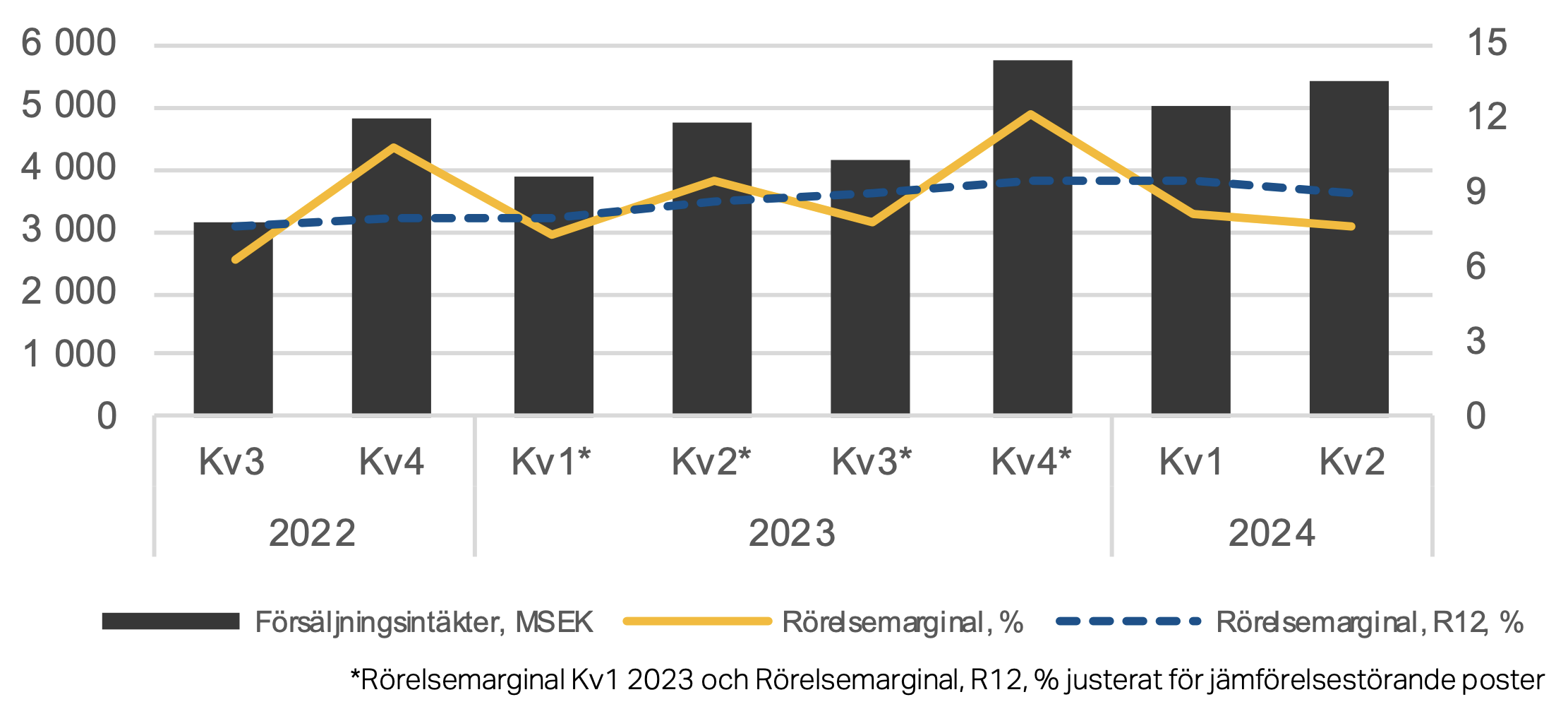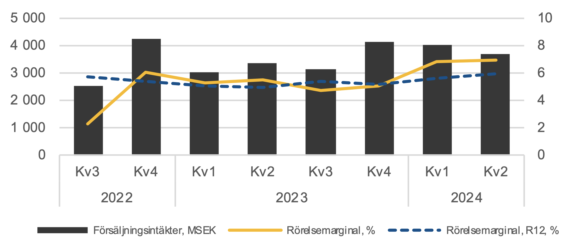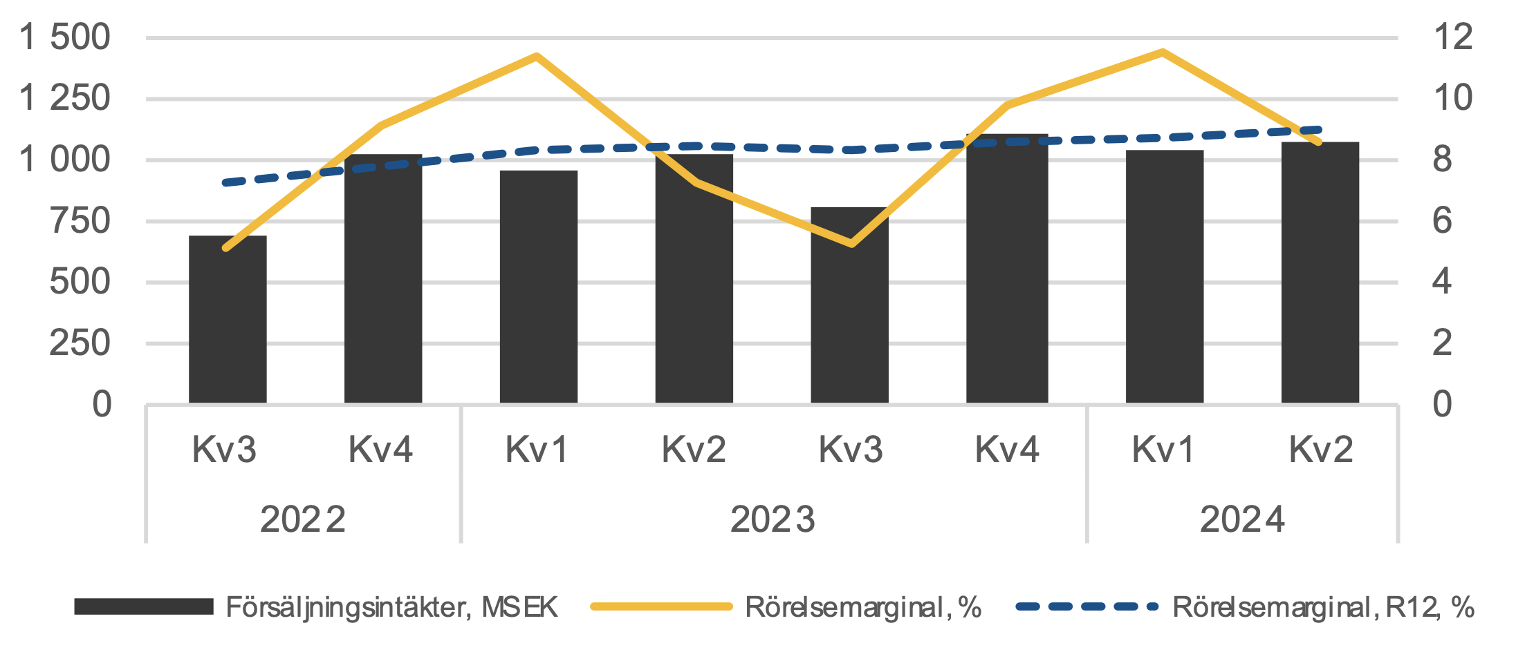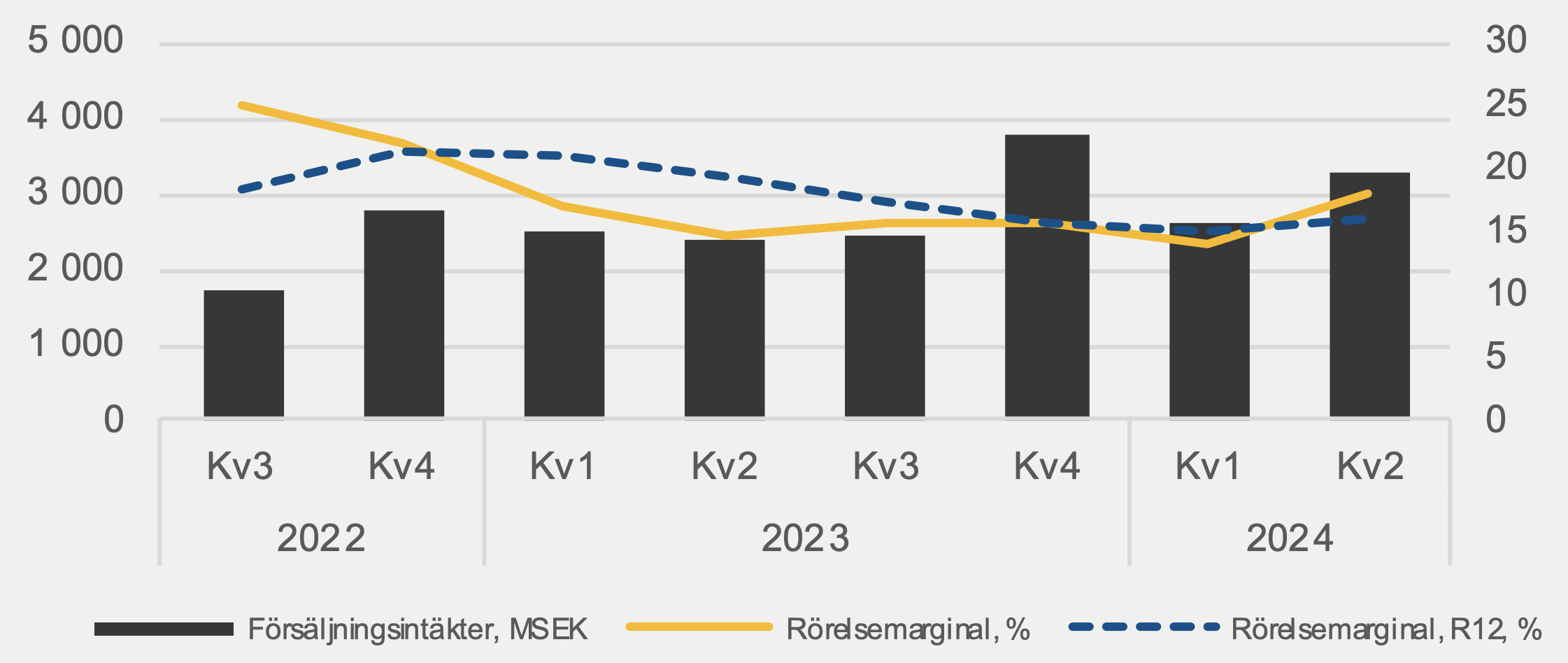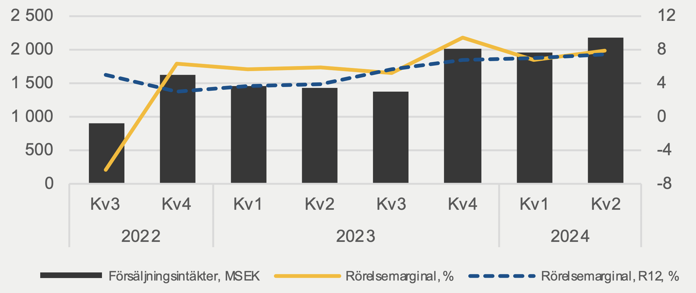 Bilden ovan visar intäkter, rörelsemarginal per kvartal och 12 månaders rullande rörelsemarginal, mellan 2022 och 2024. Tillväxten har varit stadigt stigande sedan Q3 år 2022 och uppgick till nästan 5,4 mdkr under Q2 2024.
