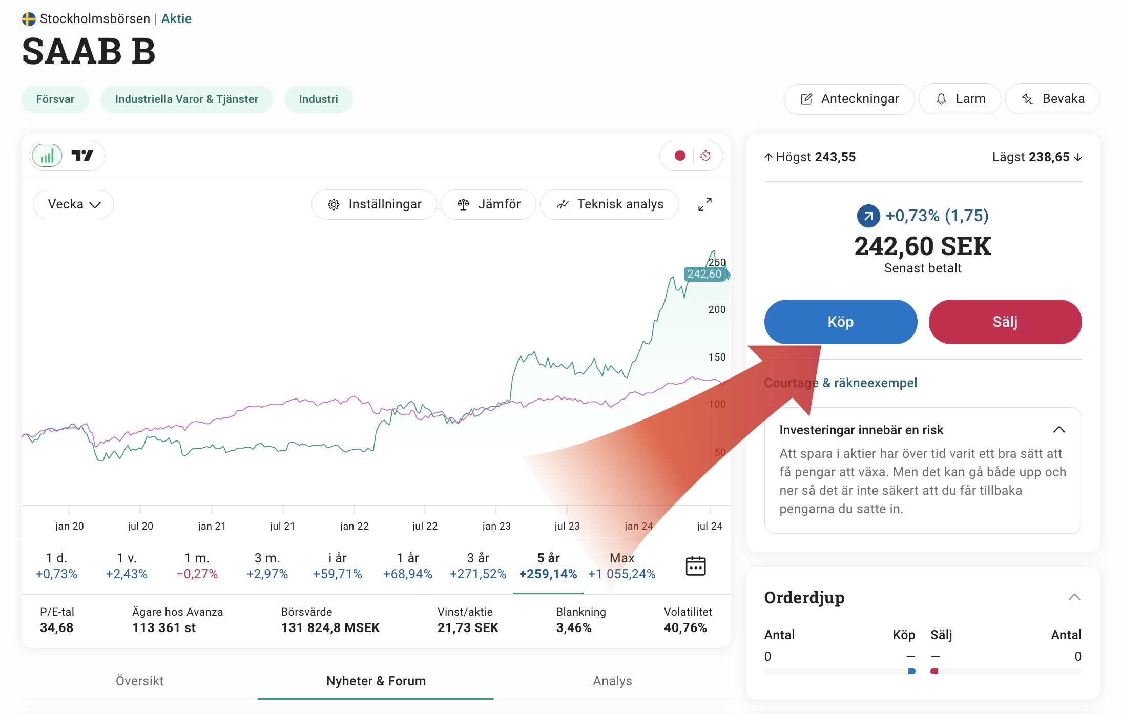 Idag finns Saab (SAAB B) tillgänglig att handla hos både eToro och Avanza. Aktien tillhör OMXS30-index och är alltså en av de 30 mest omsatta aktierna på Stockholmsbörsen. Längre ner i denna guide visar vi dig hur du går tillväga för att köpa aktier i bolaget på endast 5 minuter. Läs mer i kapitel 5.