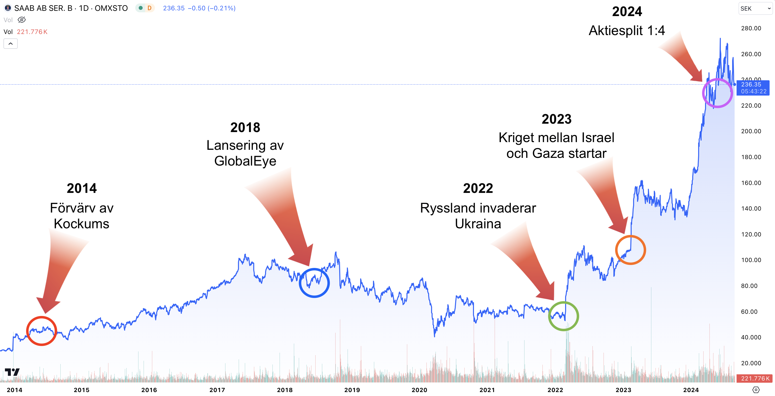 Detta kapitel ger dig en översikt av Saabs aktiekursutveckling under perioden 2014 till 2024. Grafen som följer illustrerar både kursens rörelser och 5 viktiga nyckelhändelser som påverkat bolagets verksamhet och aktiekurs. Mer detaljer om dessa specifika händelser finns att läsa om under grafen.