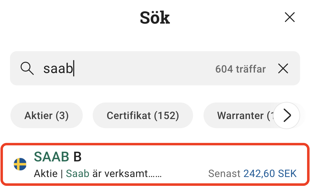 Har du pengar på ditt konto? Då klickar vi på sökknappen, söker och väljer SAAB B aktie.