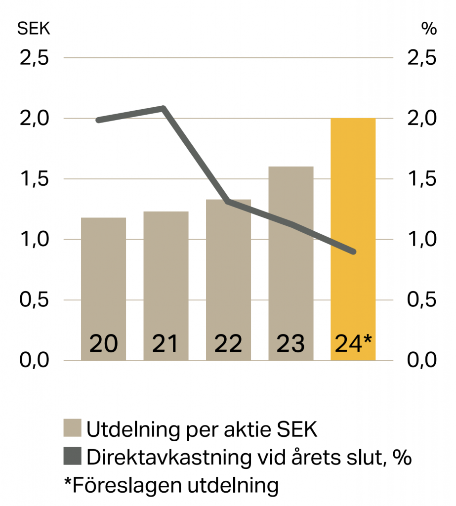 Grafen ovan visar Saabs utdelningshistorik från 2020 till 2024. Värt att notera är att utdelningen som visas i form av staplar, ges ut året efter det räkenskapsår som presenteras nedanför staplarna. För räkenskapsåret 2024 står det att utdelningen uppgick till 2.00 kr per aktie, vilket alltså inte delades ut förrän våren 2025.