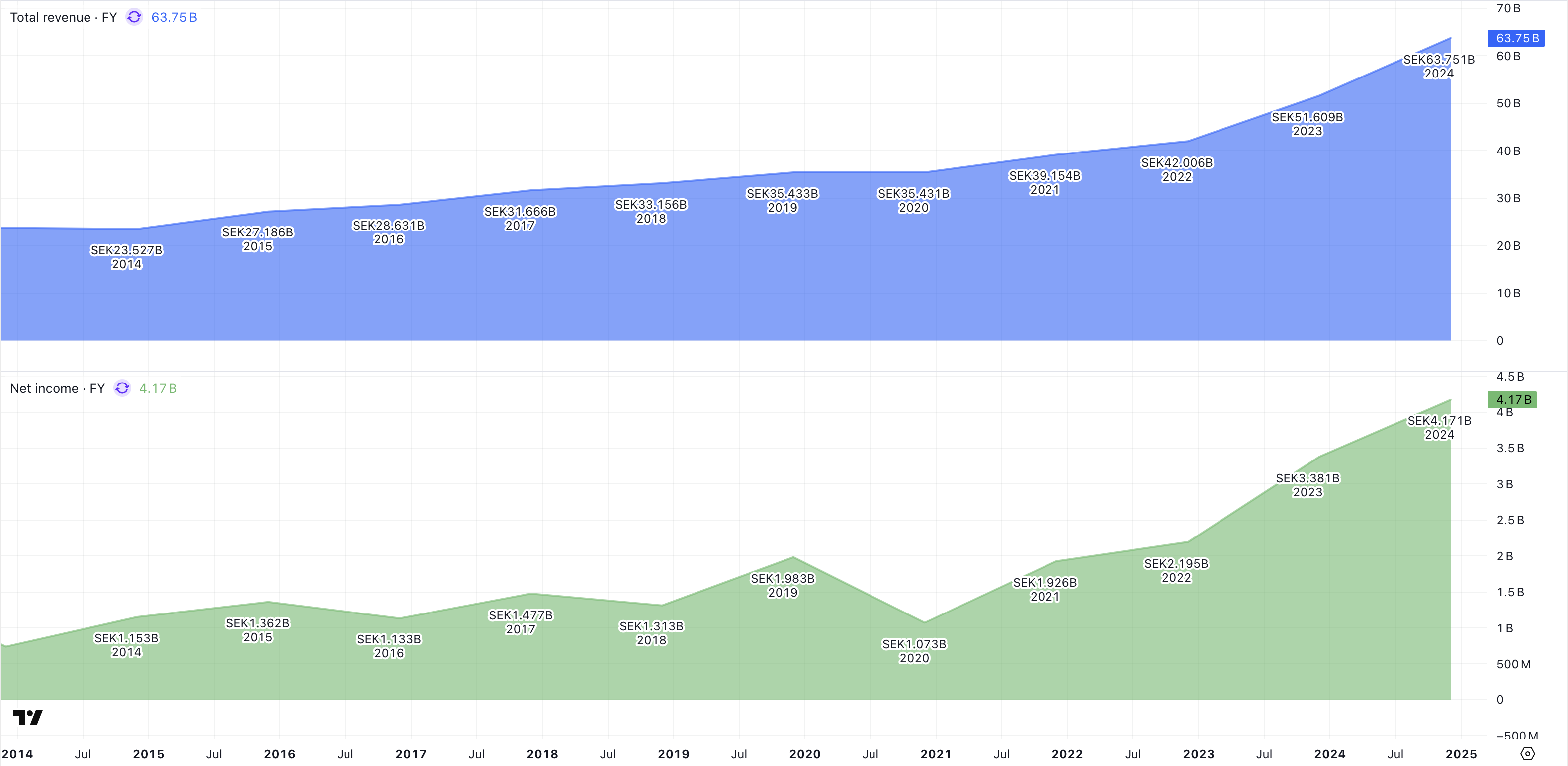 Det gröna fältet från grafen ovan visar bolagets vinsttillväxt, mellan 2014 och 2024. För 2014 uppgick vinsten till totalt 1,15 miljarder kronor. År 2024 uppgick den istället till 4,17 miljarder kronor. Det ger en ackumulerad tillväxttakt på närmare 14 % per år.