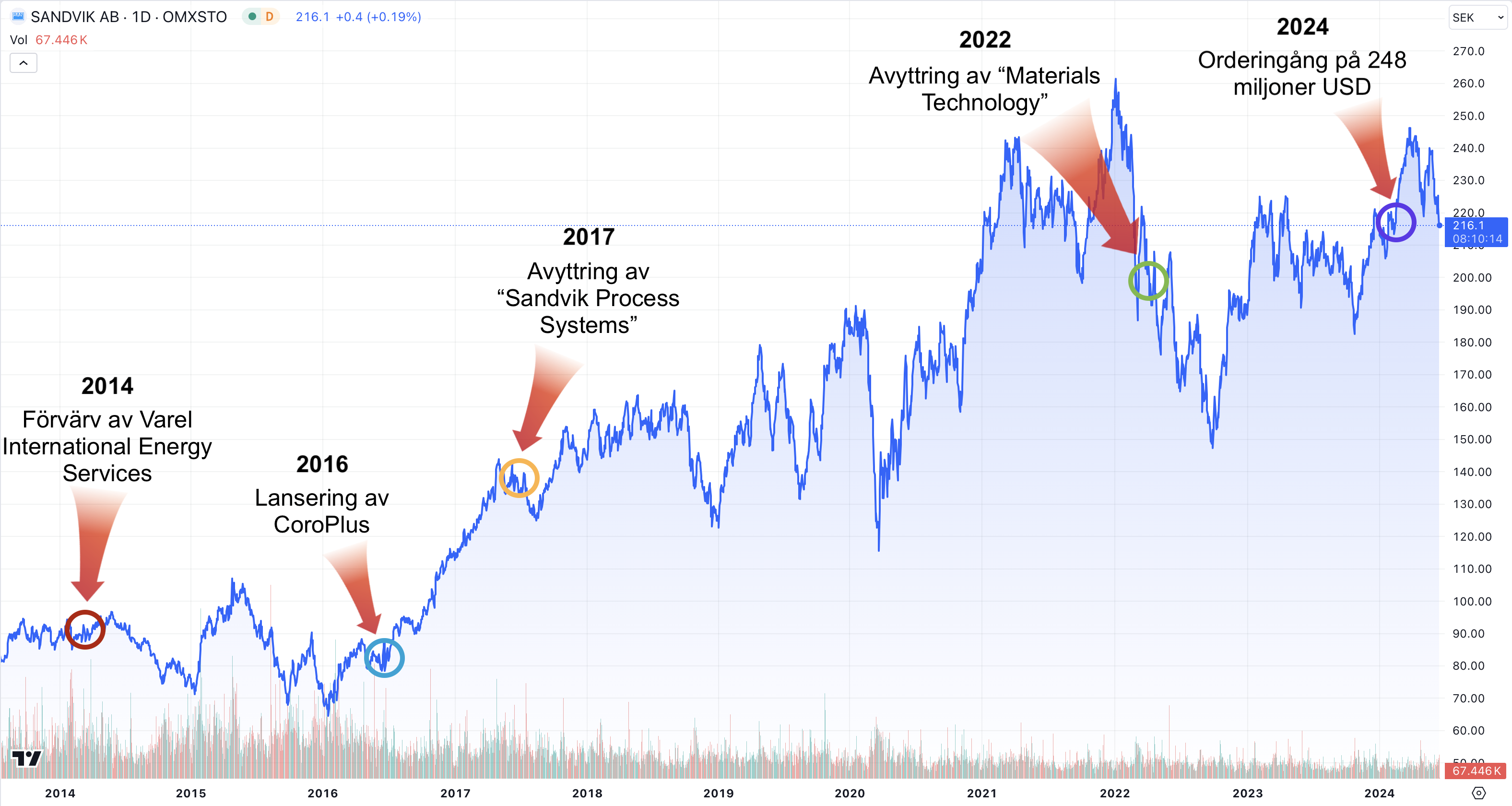 Nedan nämns kort om 5 viktiga bolagshändelser som skett mellan 2014 och 2024. De finns markerade i grafen ovan.