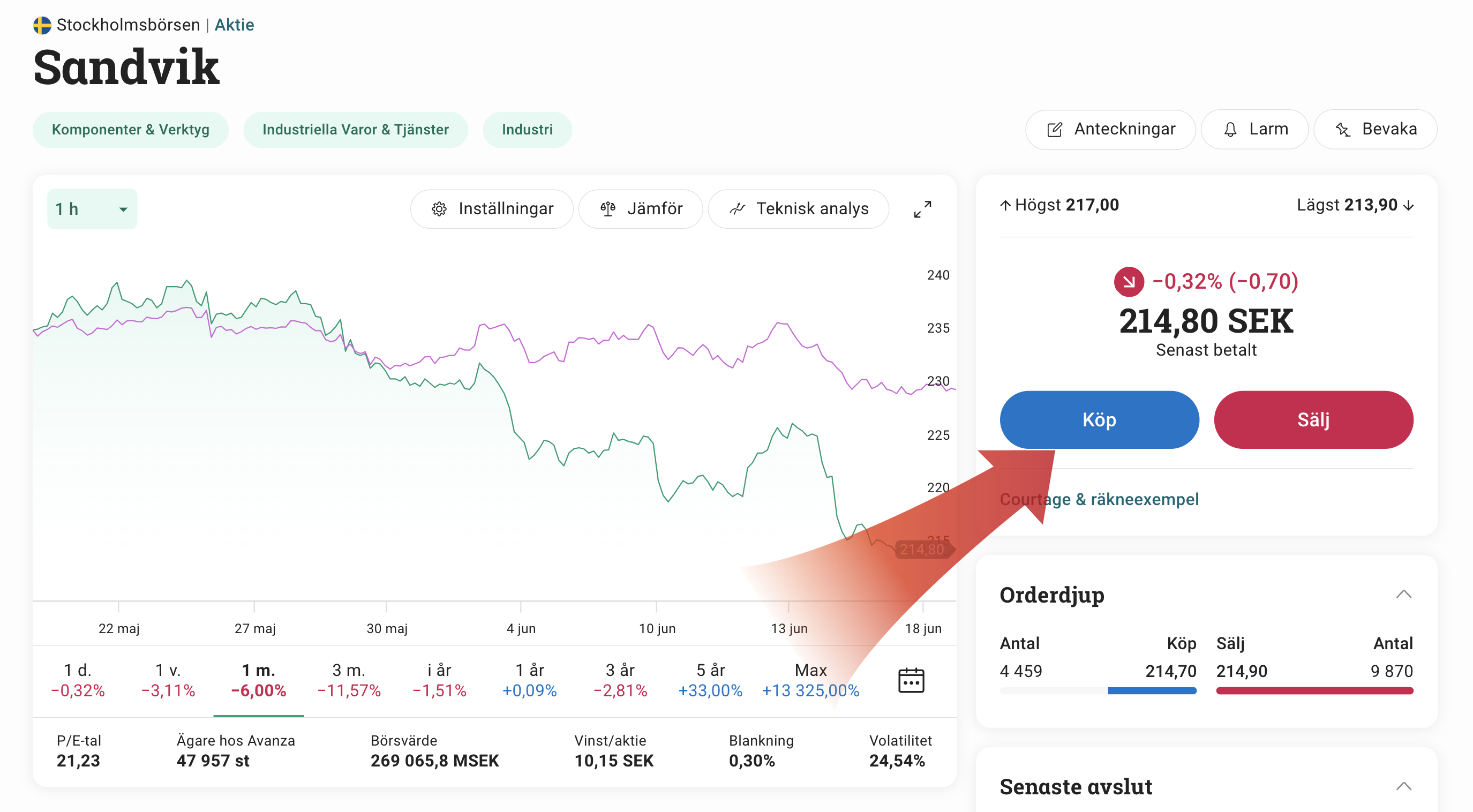 Sandvik (SAND) kan handlas hos både eToro och Avanza. Aktien tillhör OMXS30, vilket är ett aktieindex som representerar de 30 mest handlade bolagen på Stockholmsbörsen. Läs mer i kapitel 5.