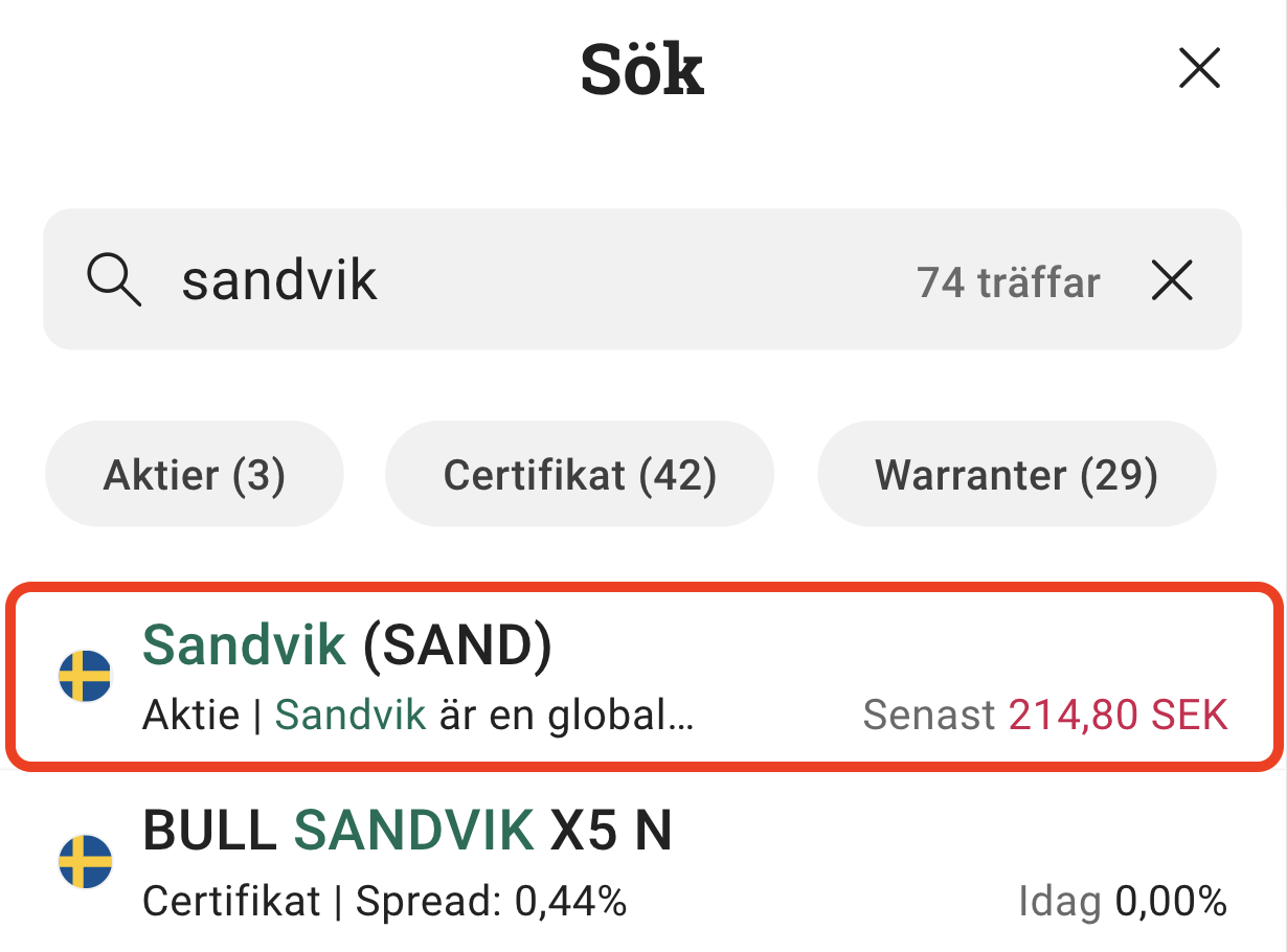 4. Sök efter Sandvik aktie