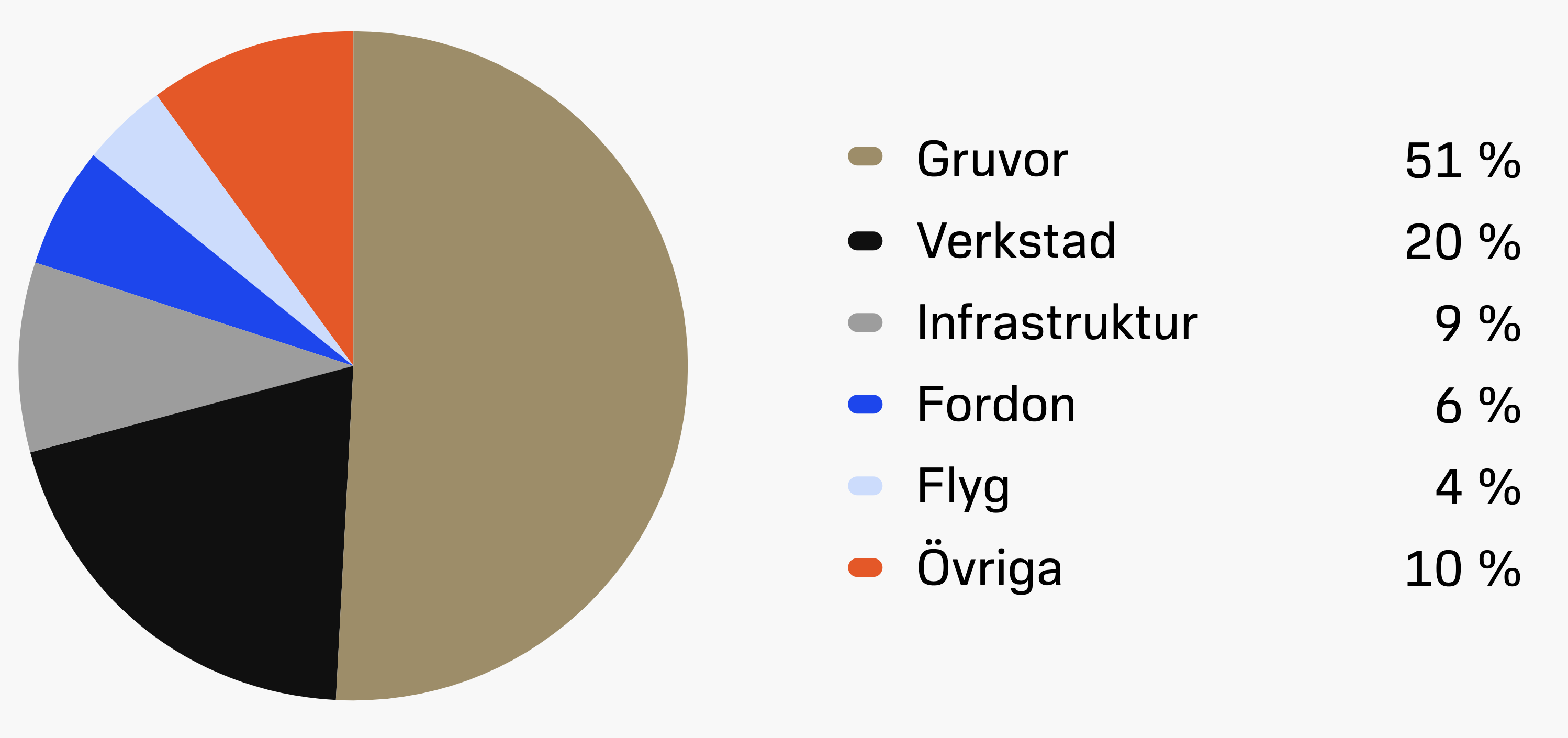 Bilden ovan visar hur Sandviks omsättning ligger fördelad mellan olika kundsegment. Det går tydligt att se hur gruvindustrin utgör största andel på 51 % av den totala omsättningen, följt av verkstadsindustrin på 20 % och infrastruktur på 9 %. Diagrammet visar alltså hur Sandvik är mest exponerat mot gruvbranschen, medan övriga industrier spelar en mindre men ändå betydande roll för bolagets totala resultat. Läs mer i kapitel 3.