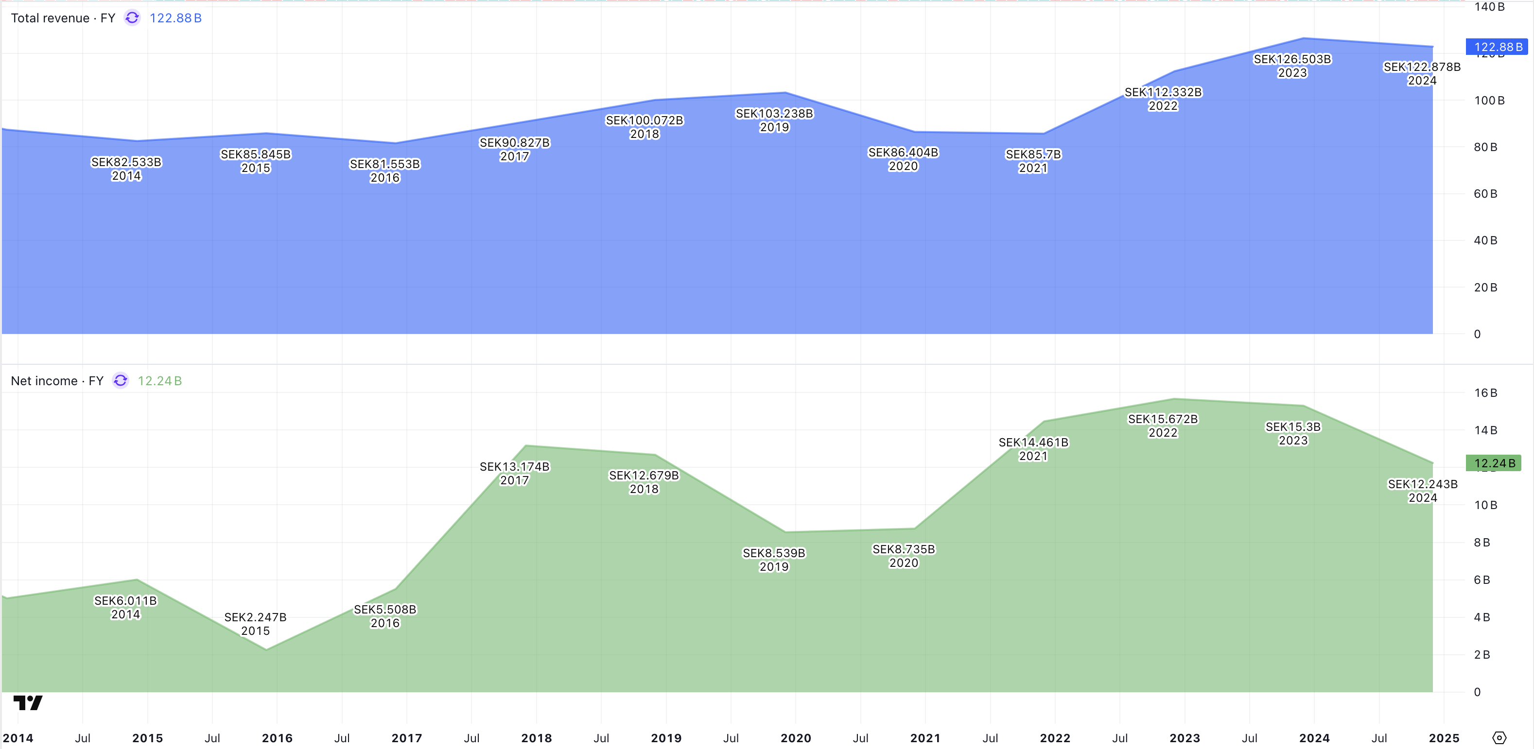 År 2014 uppgick bolagets omsättning och vinst till 82,53 miljarder kronor. År 2024 landade vinsten på 122,87 miljarder kronor. Det motsvarar en ackumulerad genomsnittlig tillväxt på nästan 4 % per år.