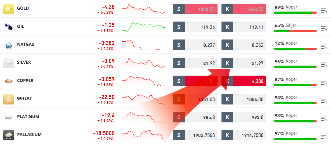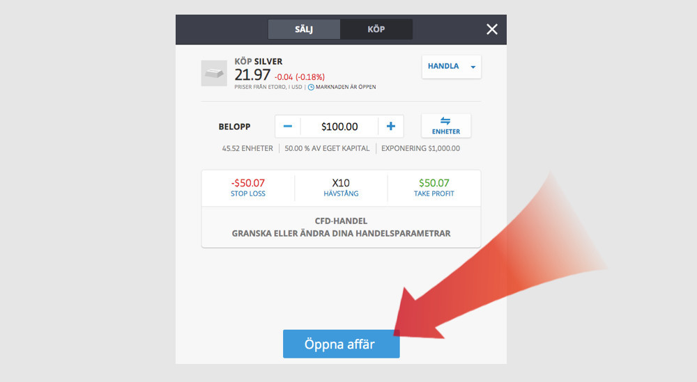 Om du tror att silverpriset kommer att öka kan du välja att köpa ett CFD-kontrakt. Tror du att priset kommer att sjunka kan du ta en säljposition. eToro erbjuder dig att kunna köpa och sälja silver med CFD-kontrakt för 0 kr. Du kan dessutom handla med hävstång på upp till x5 vid CFD-handel.