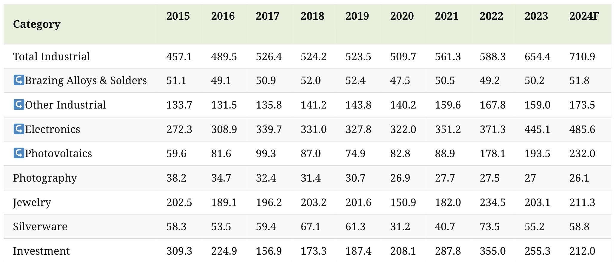En annan produkt där silver är en viktig komponent, och där vi troligtvis kommer att få se en ökad efterfrågan, är solpaneler. Solpaneler står redan idag för en stor del av den totala förbrukningen. Efterfrågan på silver för solpaneler väntas öka som en satsning av att vilja minska koldioxidutsläppen. Nedan visas en tabell över efterfrågan på silver inom olika områden.