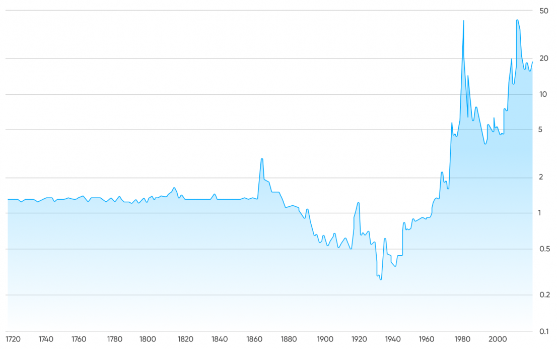 Diagrammet visar silverpriset mätt i troy uns i dollar och dess utveckling mellan 1720 och 2020. Silverpriset var till en början stabilt mellan 1720 enda fram till mitten av 1800-talet då det amerikanska inbördeskriget började. Nedanför diagrammet kan du läsa om olika historiska händelser som påverkat silverpriset.