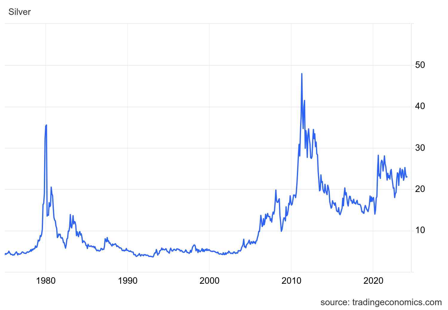 Diagrammet visar silverpriset mätt i troy uns i dollar och dess utveckling mellan 1975 och 2024.