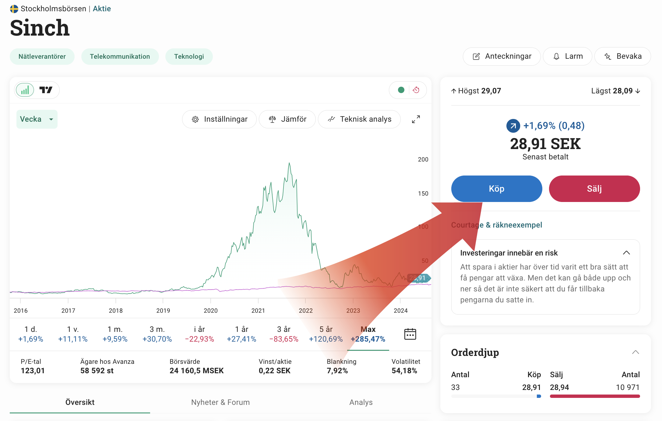 Avanza är Sveriges mest populära nätmäklare med över 1,86 miljoner kunder. De erbjuder gratis handel i aktier på Stockholmbörsen för upp till 50 000 kr. Nedan visas steg-för-steg hur du öppnar ett konto och köper Sinchs aktie på 5 minuter.