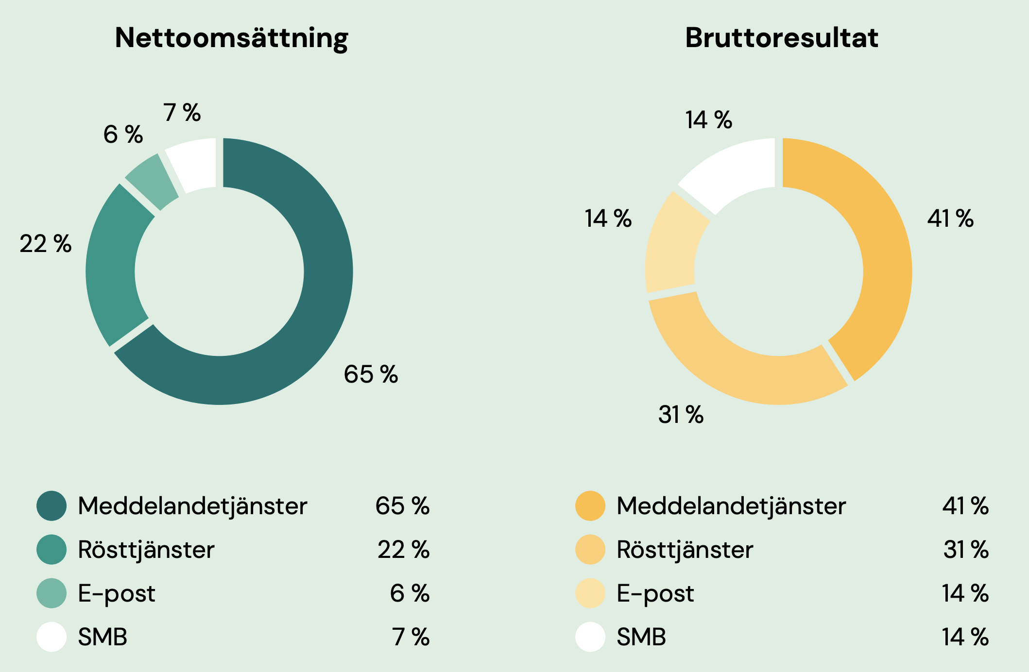 Bilden nedan visar hur omsättningen och bruttoresultatet är fördelade över Sinchs 4 affärssegment – meddelandetjänster, rösttjänster, e-post och SMB.