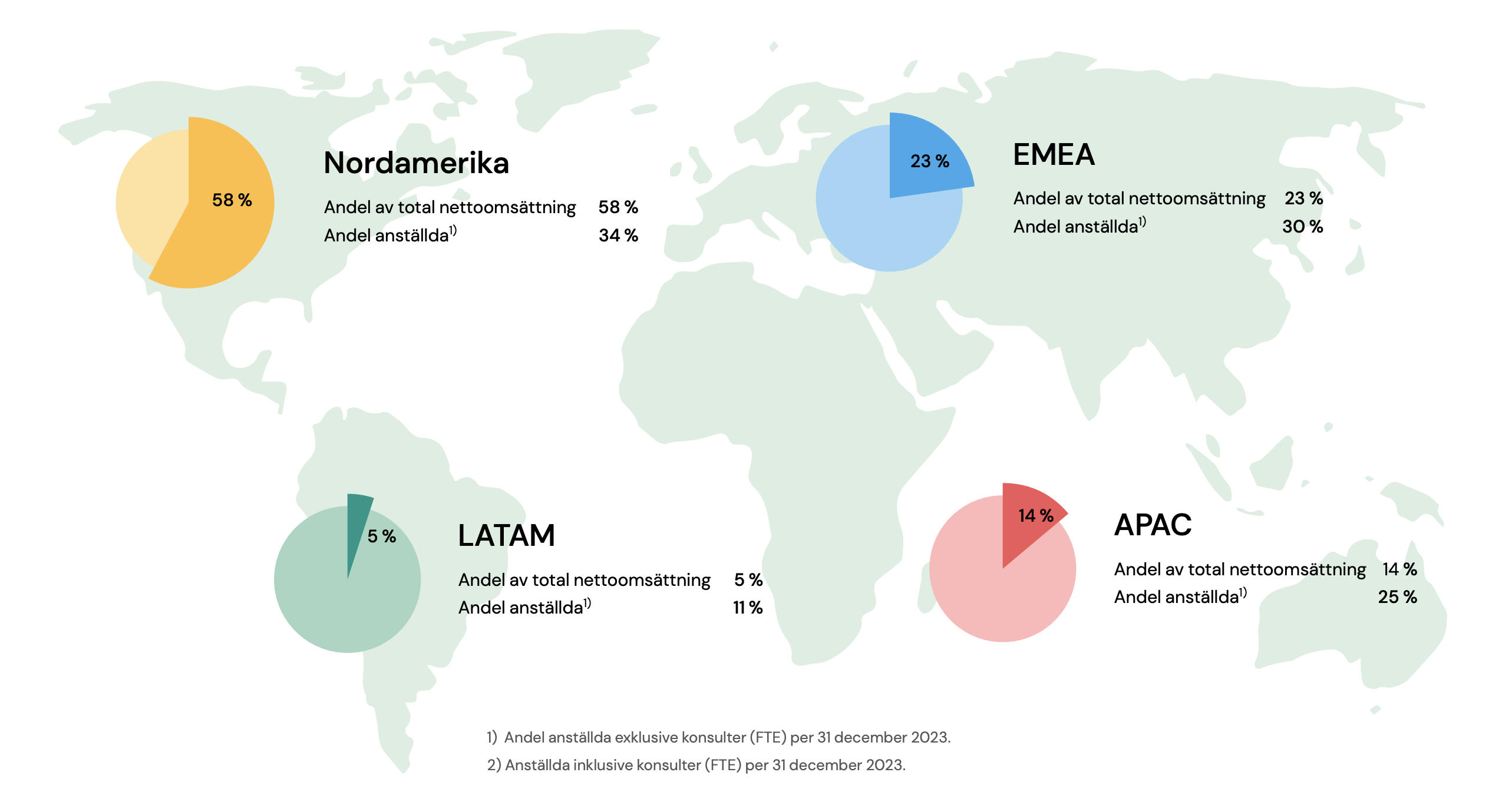 - APAC – APAC står för Asien-Stillahavsregionen, vilket inkluderar länder som Australien, Nya Zeeland, Kina och Japan. Detta geografiska område stod för 14 % av den totala omsättningen år 2023. Exempel på kunder/samarbetspartners är Alibaba, Grab och Tencent.