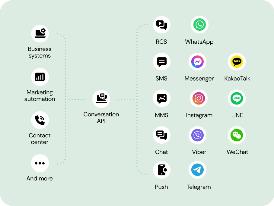 Bilden nedan visar hur Sinch, genom sin egen API/plattform, fungerar som en bro mellan företag och deras kunder via olika kommunikationskanaler. Som ett exempel kan ett e-handelsföretag använda Sinchs API för att automatiskt skicka ett SMS till kunder direkt efter att de har gjort en beställning.