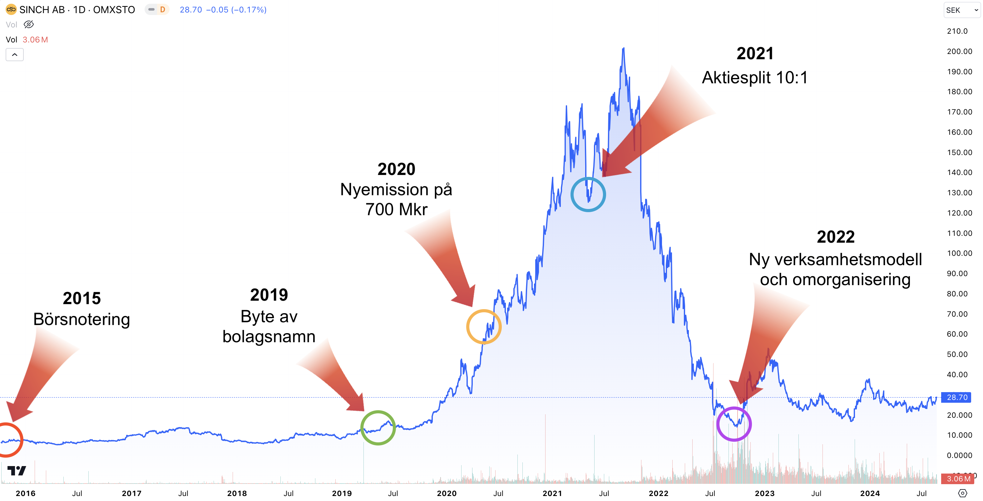 Nedan presenteras Sinch aktiekursutveckling mellan åren 2015 och 2024. Markerat i bilden finns även viktiga händelser som anses ha haft betydelse för bolagets verksamhet och dess aktiekurs på både kort och lång sikt. Dessa går att läsa om i detalj nedanför grafen.
