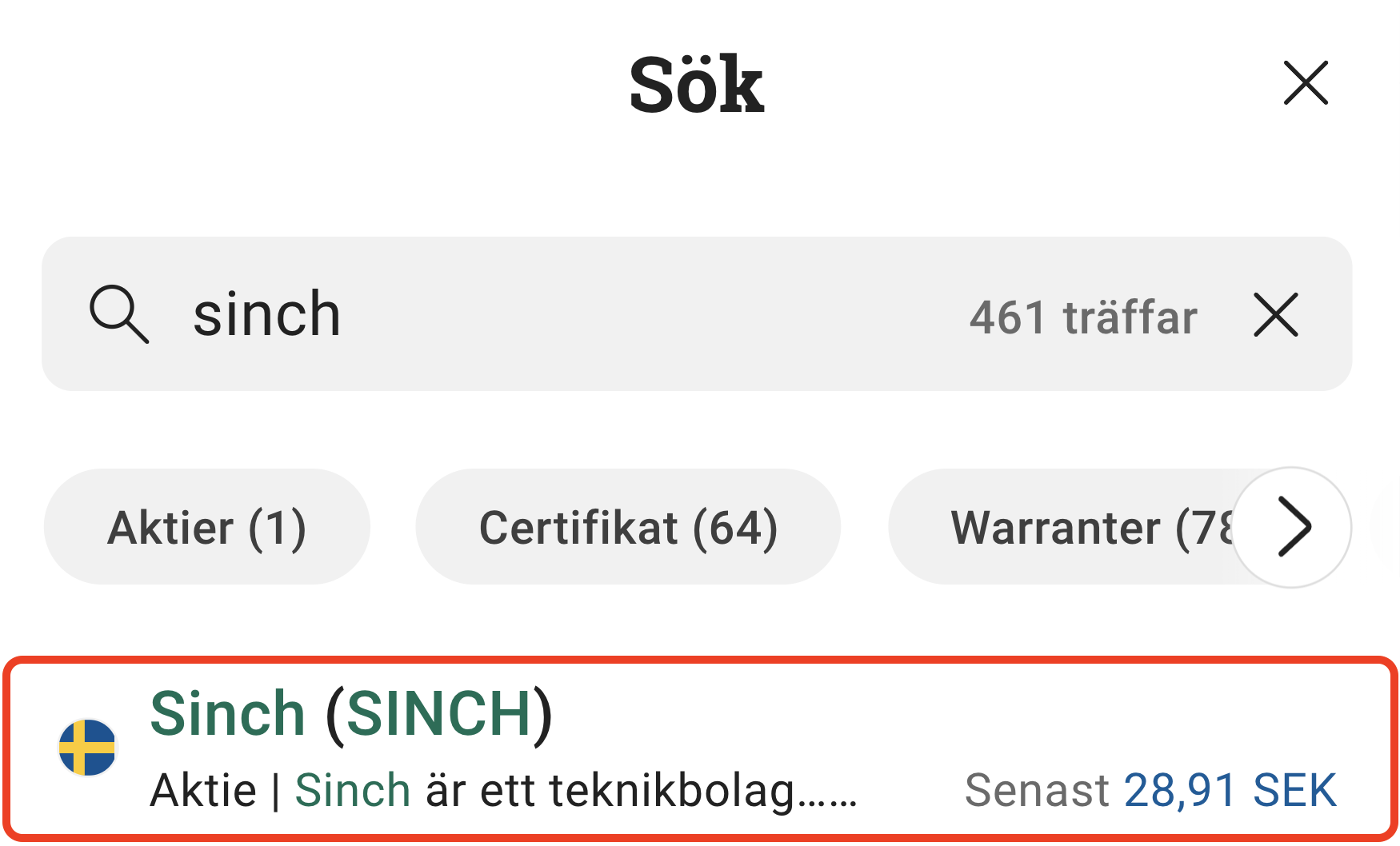 Har du pengar på ditt konto? Då klickar vi på sökknappen, söker och väljer SINCH.