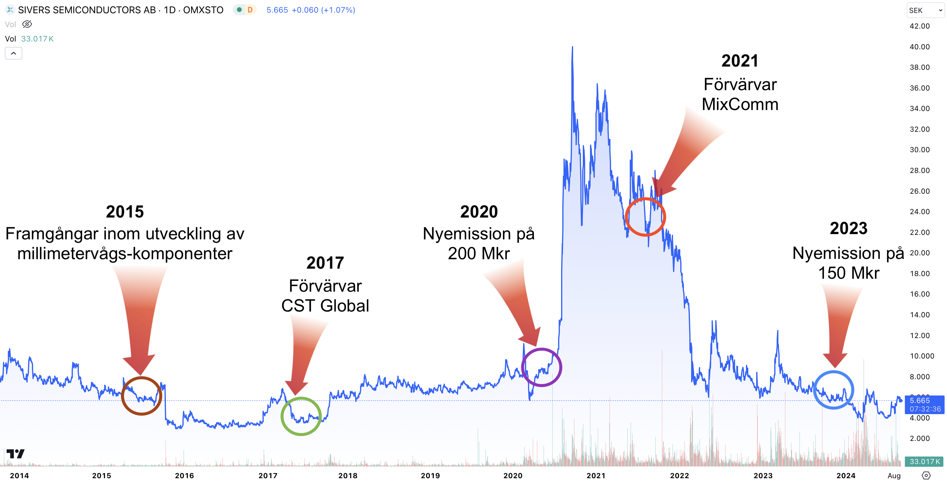 Detta avsnitt ger en översikt över Sivers aktiekursutveckling under perioden 2014 till 2024. Diagrammet nedan illustrerar dessutom 5 viktiga händelser som påverkat företagets prestation och aktiekurs, både på kort och lång sikt. Fördjupad information om dessa händelser finns att läsa längre ner under diagrammet.