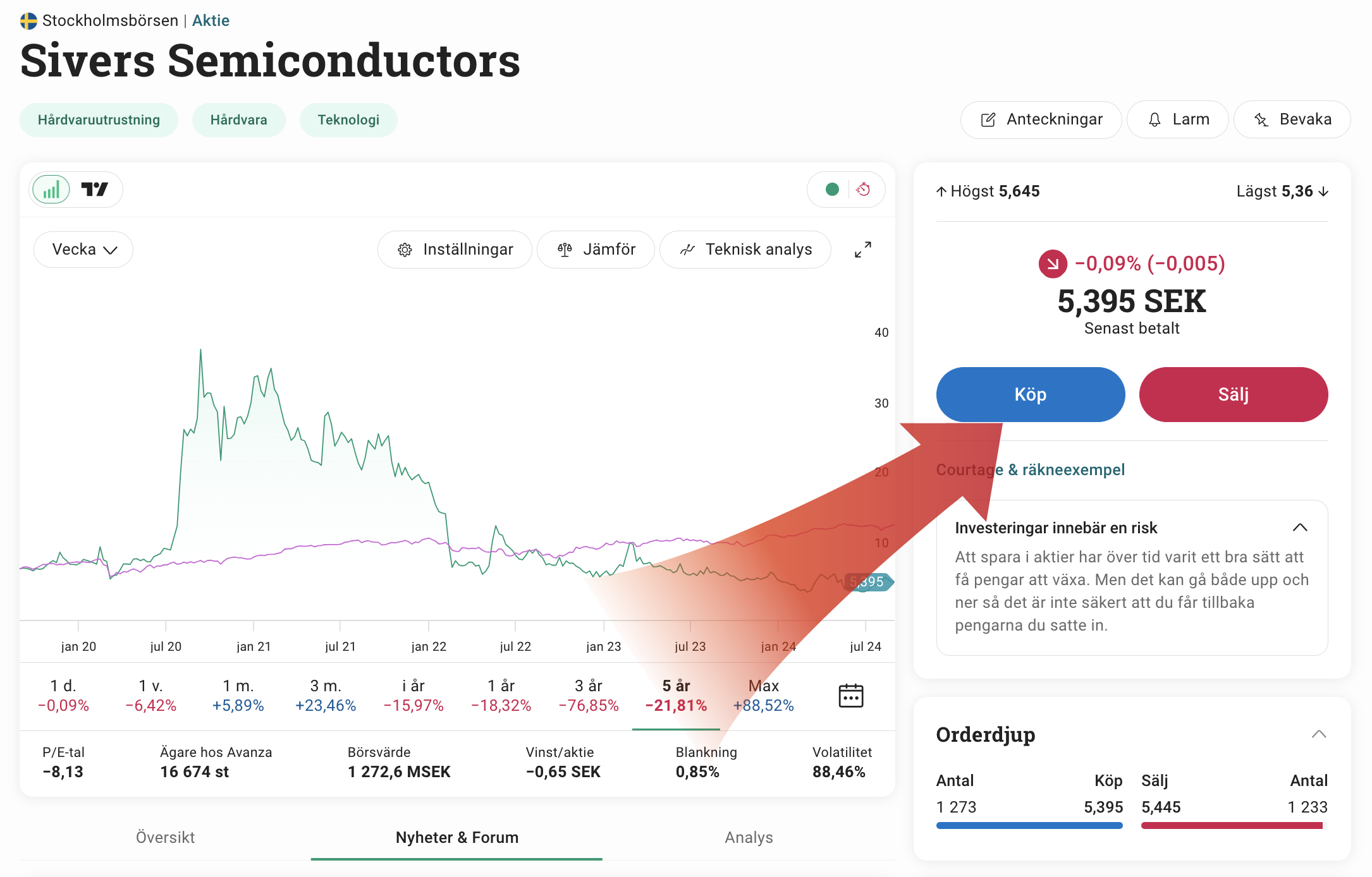 Sivers Semiconductors finns att handla hos både Avanza och Nordnet. Bolaget finns noterat på Nasdaq Stockholm sedan år 2021 under tickern “SIVE”. Längre ner finns steg-för-steg instruktioner för hur man handlar bolagets aktie. Läs mer i kapitel 5.