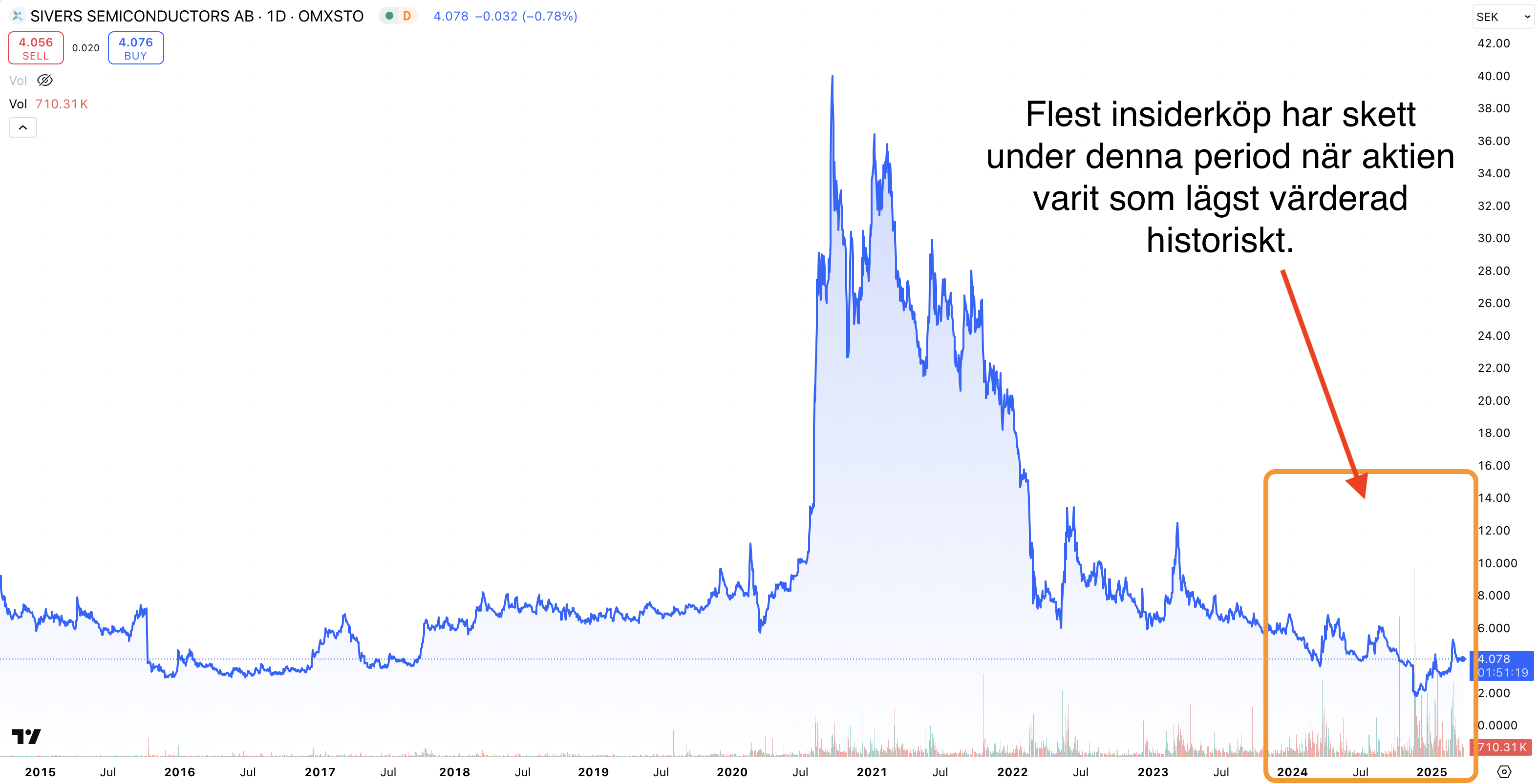 Det kan tas som ett tecken på att nyckelpersoner tror att bolaget är tillfälligt lågt värderat. Grafen nedan visar hur insiderköpen ökat kraftigt precis där aktien är som lägst värderad under en 10-årsperiod.