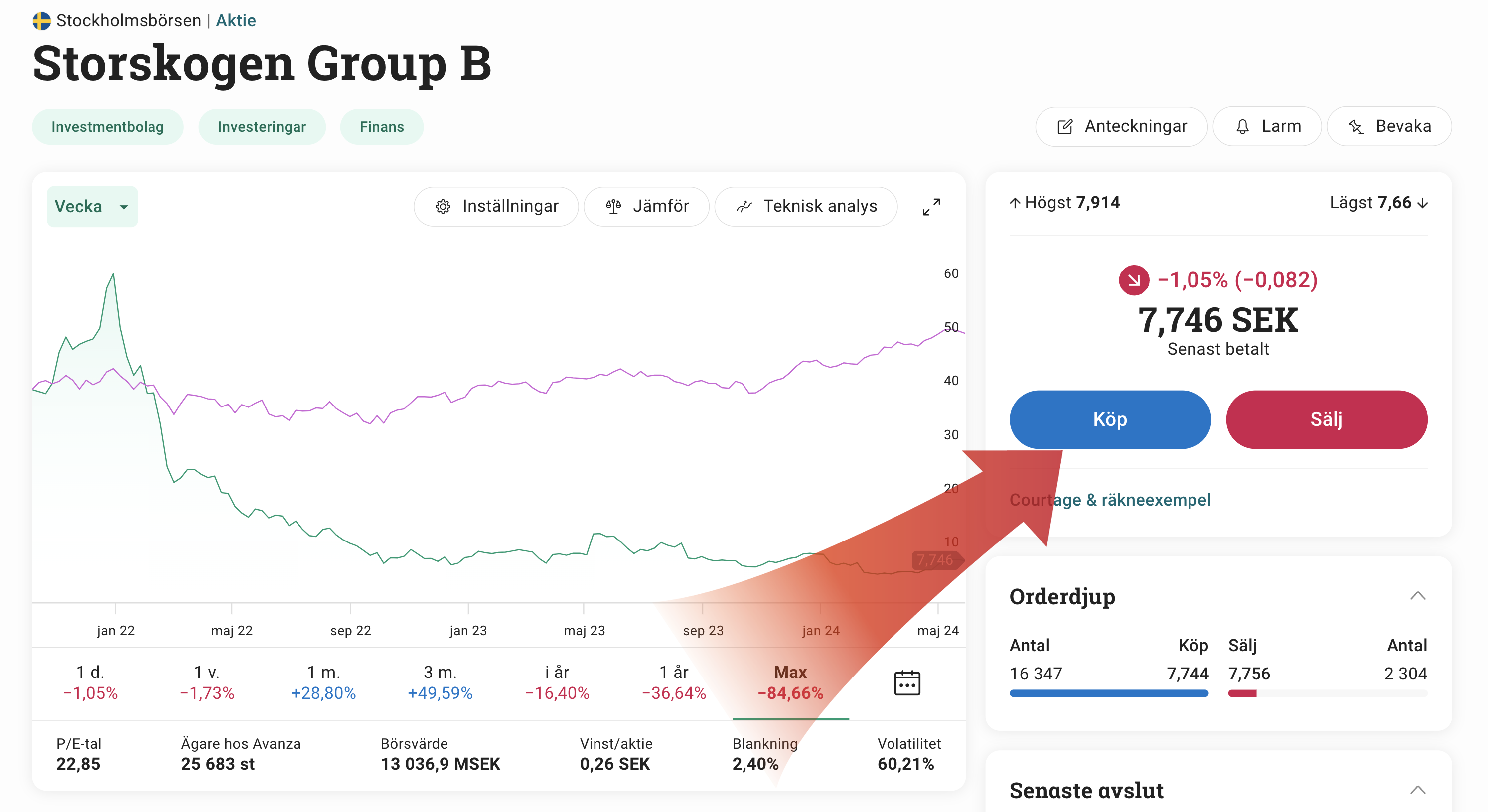 Avanza är Sveriges mest populära nätmäklare med över 1,86 miljoner kunder. De erbjuder handel i aktier från totalt 12 olika länder. Nedan visar vi steg-för-steg hur du öppnar dig ett konto och handlar Storskogen aktie på 3 minuter.