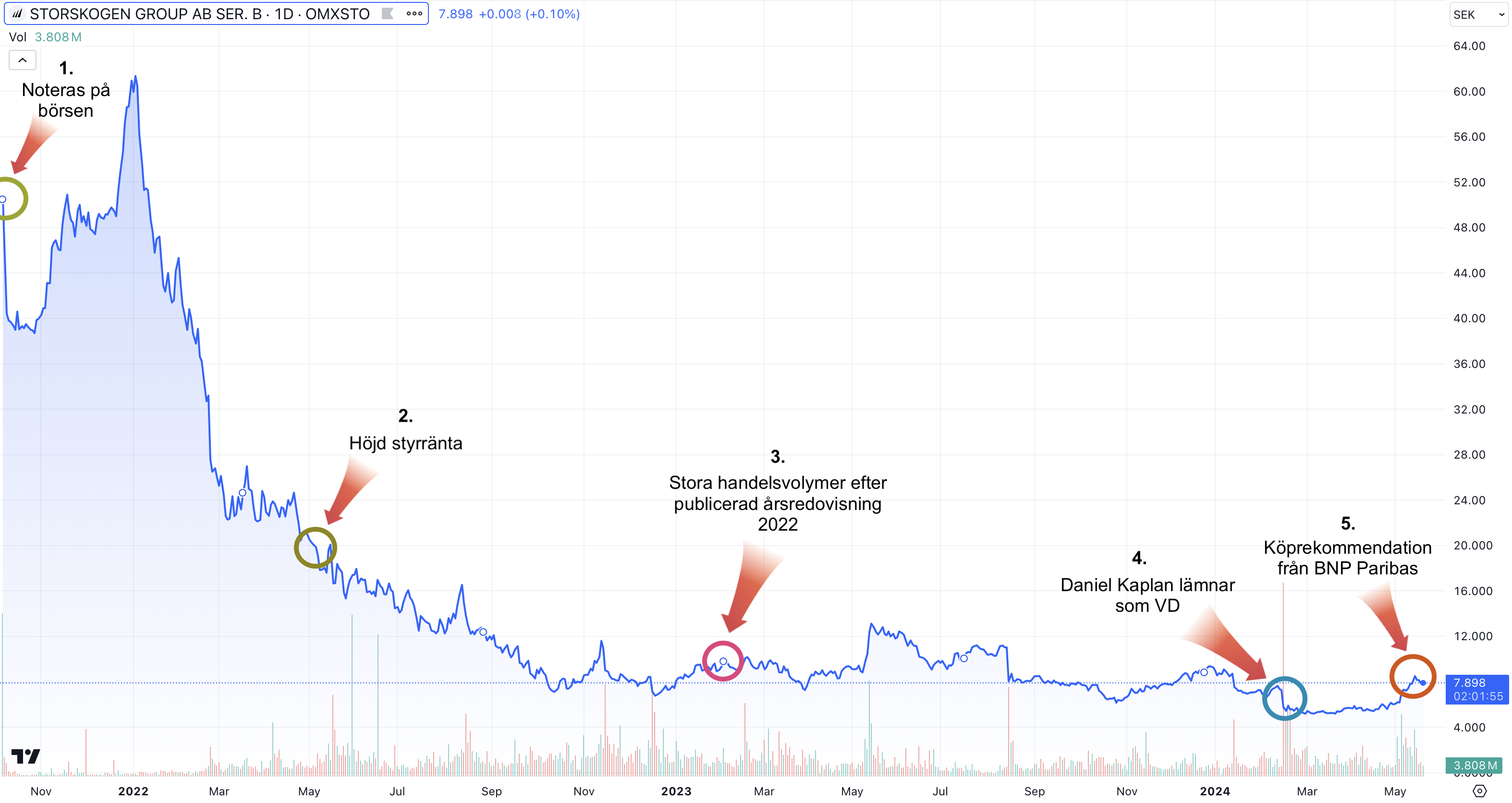 Grafen ovan visar Storskogens aktiekursutveckling sedan bolaget noterades på Stockholmsbörsen i oktober 2021. Markerat i bilden är exempel på viktiga händelser som antingen påverkat bolagets aktiekurs på kort eller lång sikt. Exempelvis bidrog en köprekommendation från banken BNP Paribas till att aktiekursen steg med 13 % på en handelsdag. Läs mer i kapitel 1.