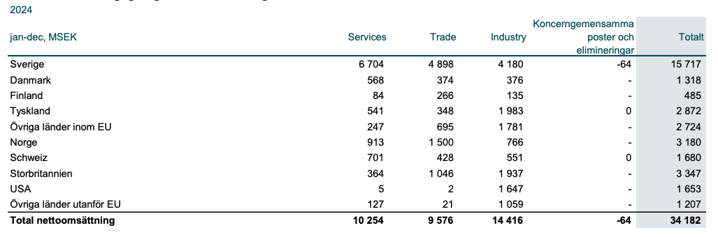 - Trade utgjorde 29 % av omsättningen och påverkades av svagt konsumentsentiment samt avyttringar, men visade tecken på återhämtning och stärkt marginal mot slutet av 2024.