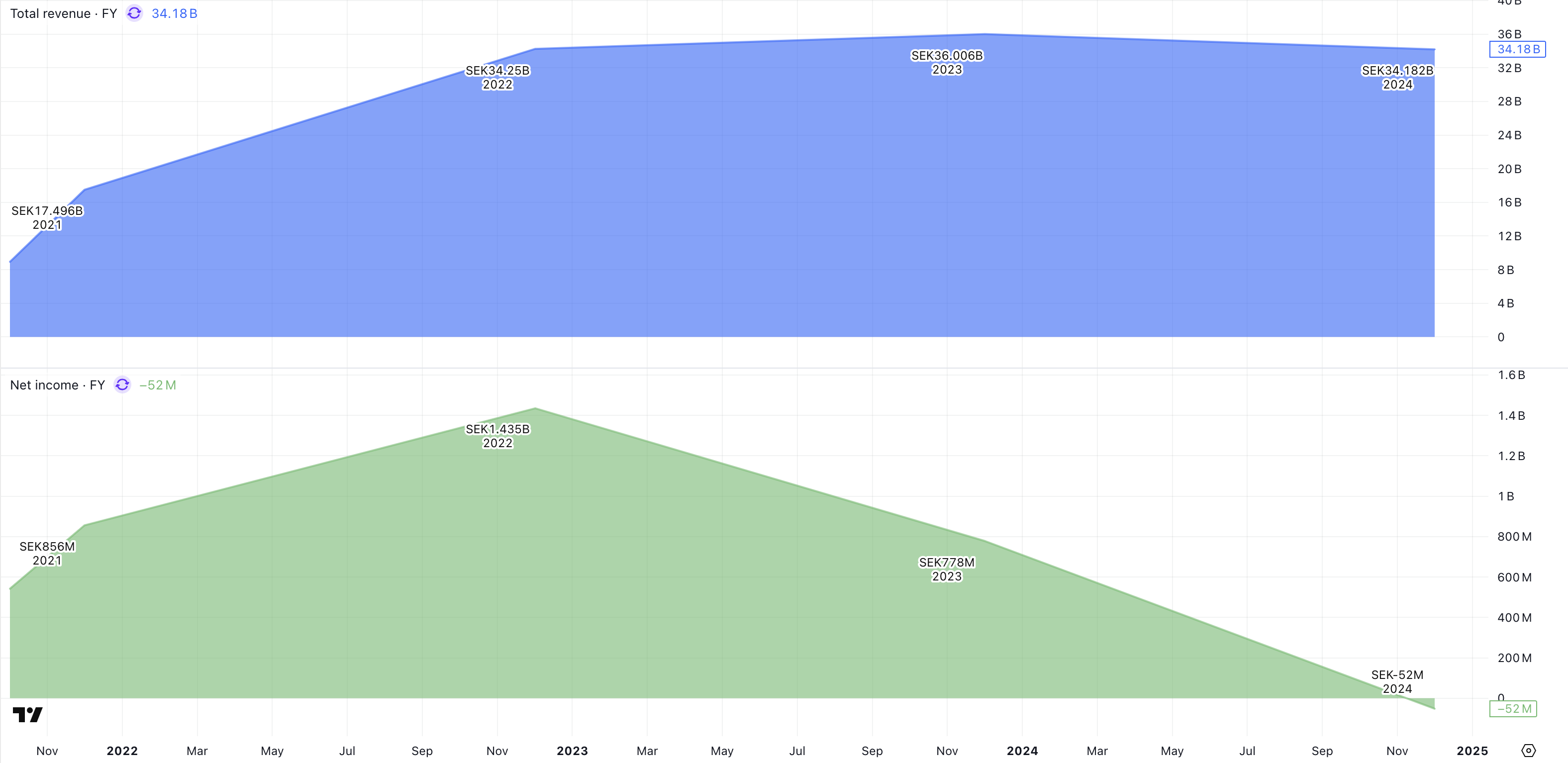 Grafen nedan illustrerar Storskogens omsättnings- och vinstutveckling från 2021 till och med 2024. Informationen är komplett men enbart bakåt till 2021 eftersom bolaget inte funnits börsnoterat under en längre period.